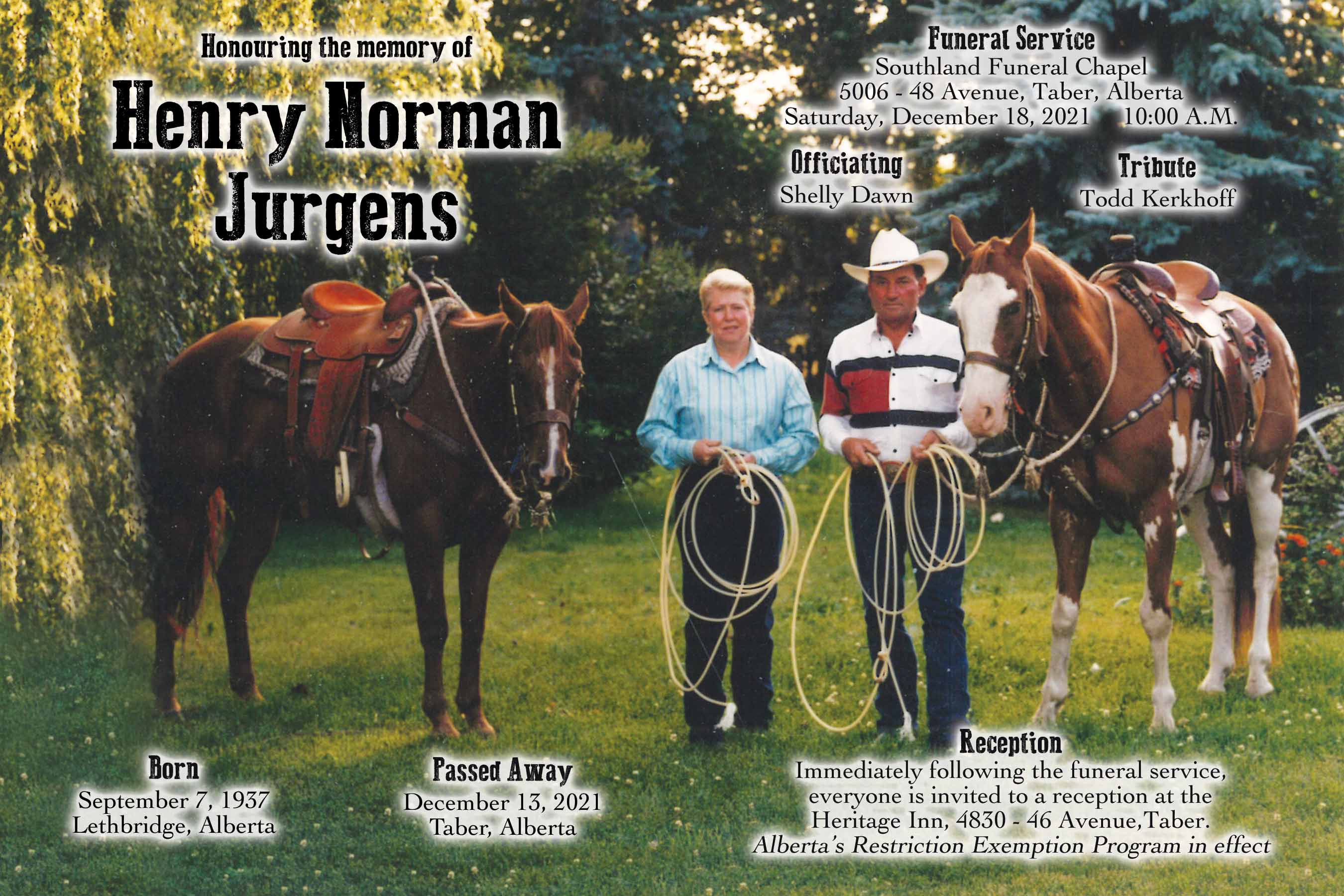 Henry Norman Jurgens, beloved partner of Millie Archer, passed away in Taber on Monday, December 13, 2021 at the age of 84 years.