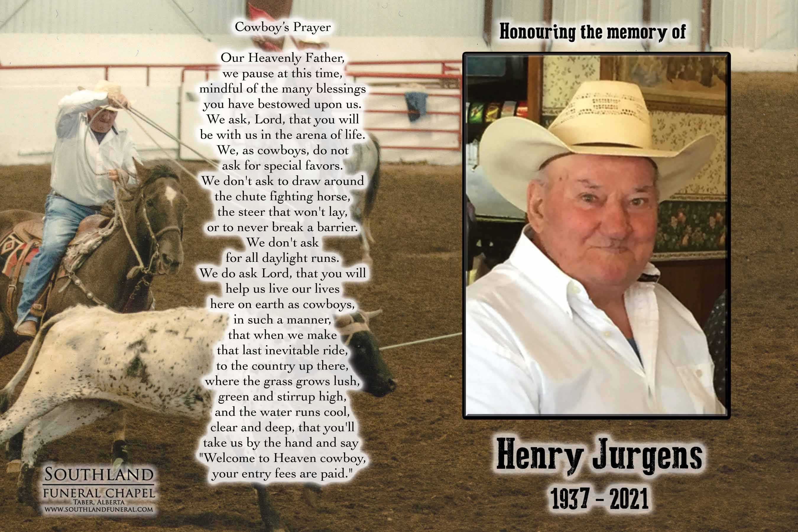 Henry is survived by his loving partner, Millie Archer and his three sons Marty (Gloria) Jurgens of Pincher Creek, Kirk (Joann) Jurgens of Lethbridge and Blake (Rhea) Jurgens of Lethbridge; grandchildren Kayley (Tim) Heggie and their children Burke and Delta, Cody (Alyssa) Jurgens, Jace (Jozie) Jurgens and their son Jaxon, Janae Jurgens and Jaden (Cody) Jurgens. He is also survived by his sister Virginia, brother Robert Jurgens, three sisters-in-law and a brother-in-law and by numerous nieces and nephews.