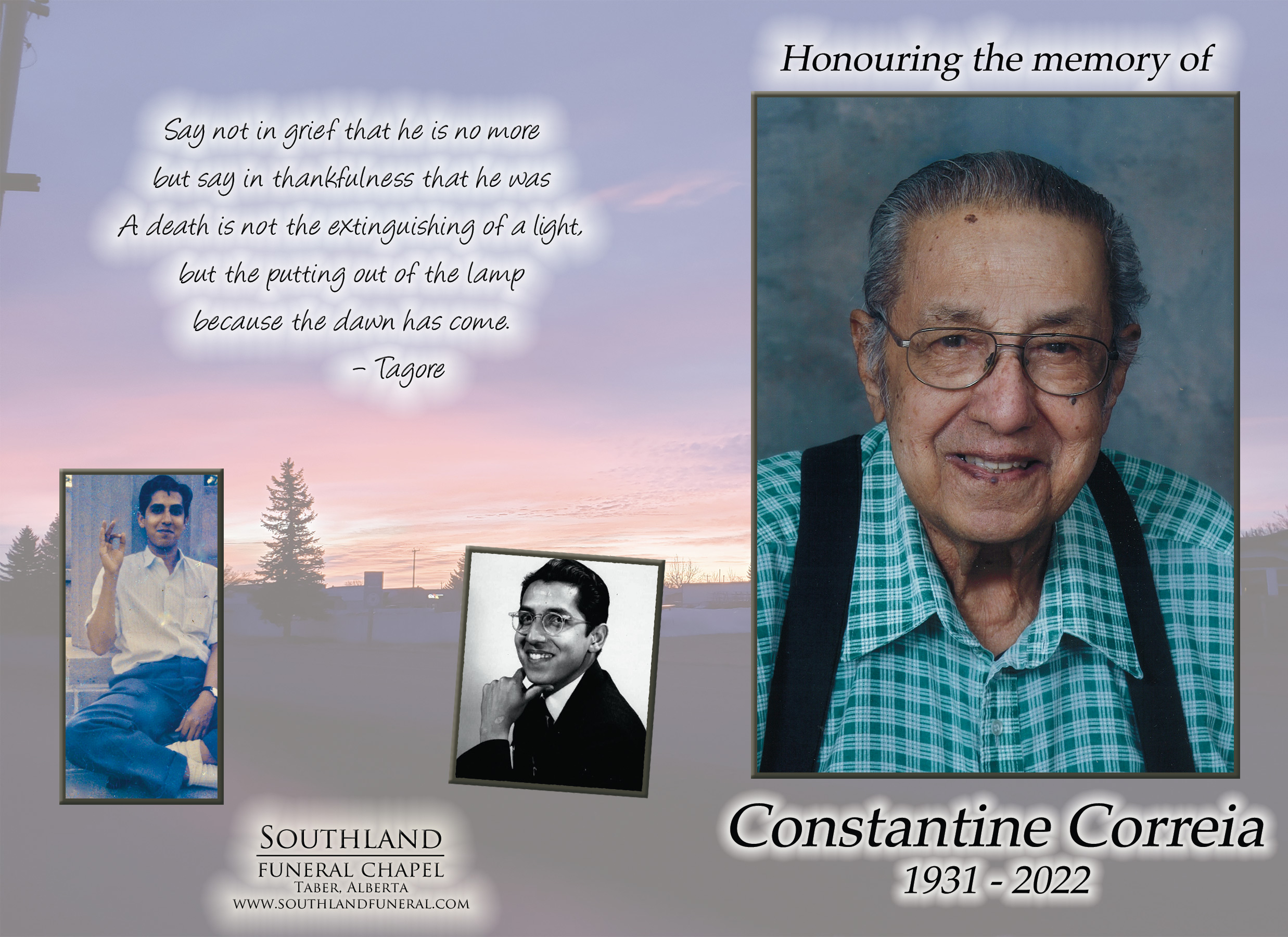 He was predeceased by his wife Antonieta Correia (née Ferros); infant daughter Constance; grandson Benjamin Correia-Webb; parents Benjamin and Louisa (née Saldanha); sisters Ruby (Francis) D’Souza, Placida (Santan) Fernandes and Carmen Correia.