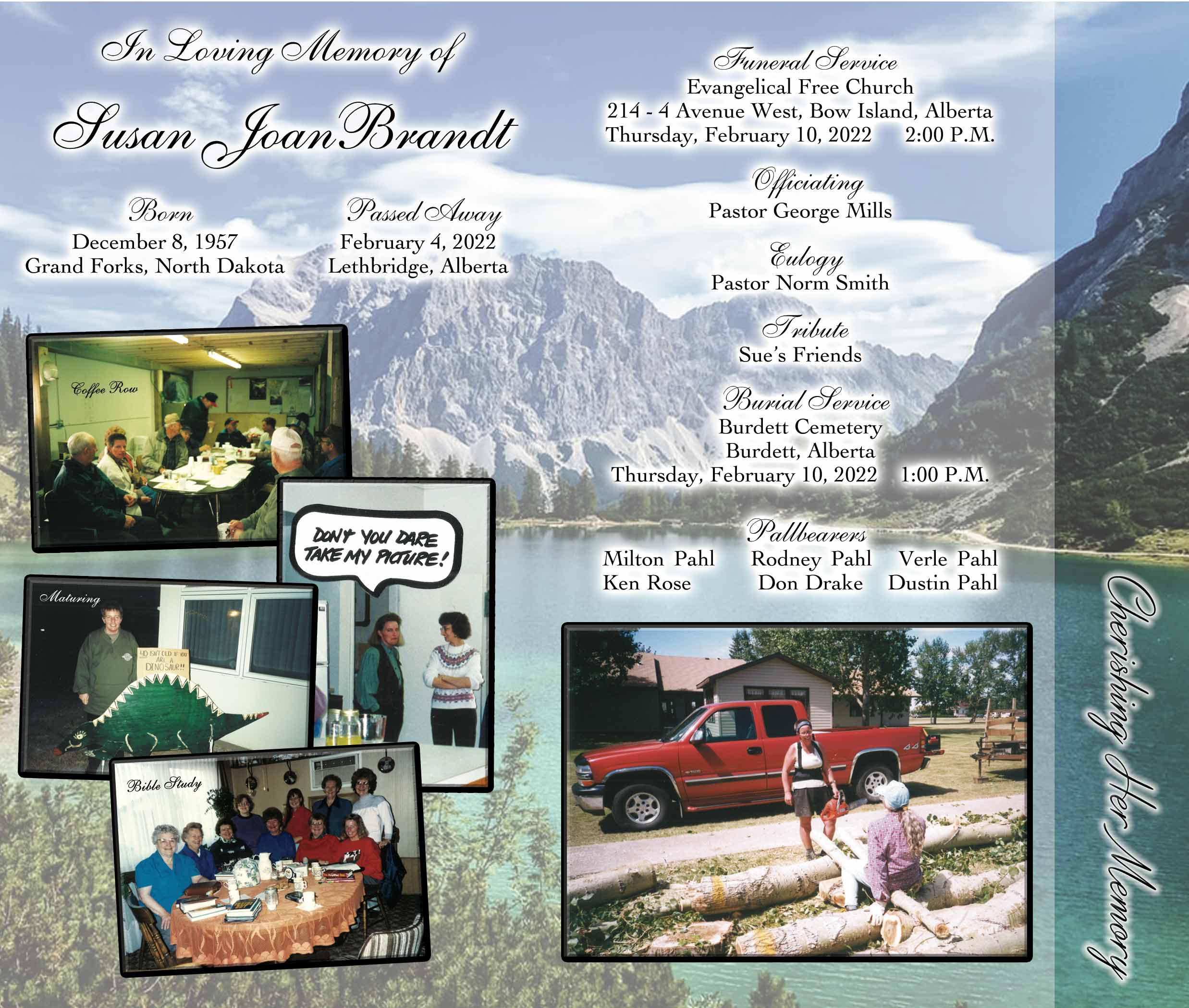 The funeral service was held at the Evangelical Free Church, Bow Island on Thursday, February 10, 2022 at 2:00 P.M.