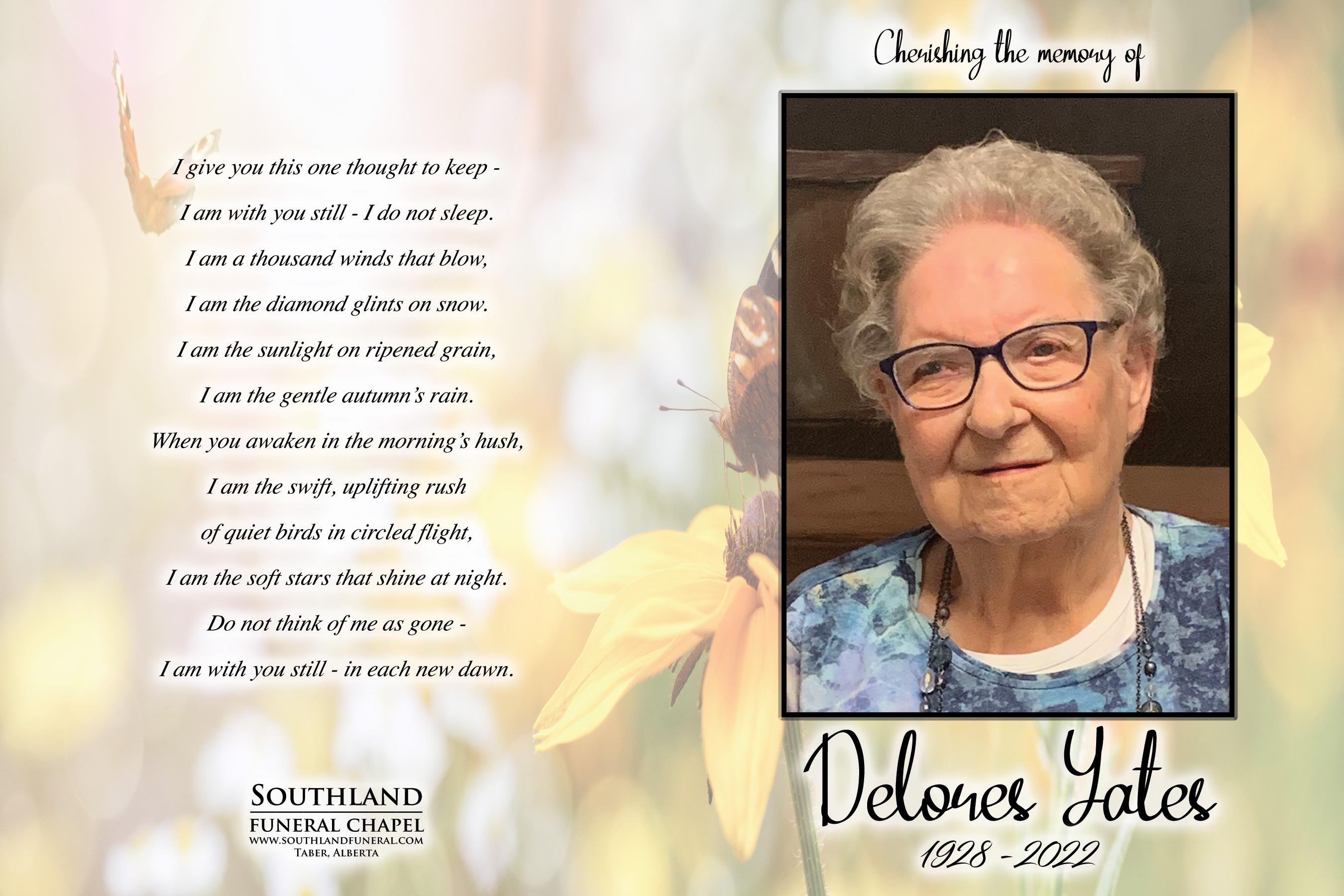 Delores was born on a farm in the Coutts area on May 16, 1928 to Fauster and Marion Ostby. She had a younger sister named Delrose and a younger brother named Donald. They moved into Coutts when she was fourteen. When she was fifteen, she went to work in the telephone office after school and took over running it before she graduated from high school. She ran it until she was twenty one. At that time, she married Bill Yates on July 15, 1949. They moved into a little trailer house. A few years later, they decided to live in Burdett. Delores and Bill went into the gravel crushing business, forming Royal Sand & Gravel Ltd., doing municipal work graveling roads throughout Southern Alberta for over fifty years. Delores did bookkeeping and cooking until their oldest son started school. They had five children and she used to go out with the children during the summer holidays when they were out of school. Delores always said that she didn’t think there was a gravel pit in Southern Alberta that they didn’t live in at one time or another. Delores was a cub and scout leader and also an active member of the Burdett United Church and a Sunday school teacher. She always said, it’s been a wonderful life. They moved all over Southern Alberta and have many friends in many places. She also said that in all their travels, she had never seen anything better than Southern Alberta.