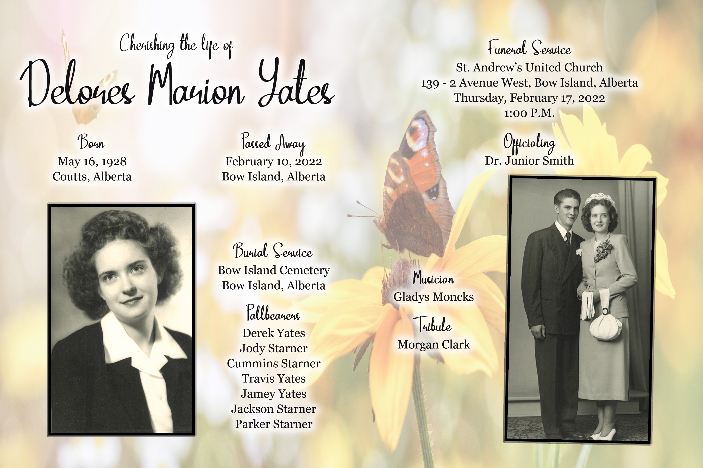 Delores is survived by her son Bob (Tish) Yates of Calgary; son Tom (Dawn) Yates of Calgary and their family Travis (Bridget) Yates (their children Aven and Violet), Jamey Yates and Breanne and Rob Hanna (their children Lexi and Elli); son Gary (Shelley) Yates of Bow Island and their family Cassandra (Ryan) Kielstra (their children Alexa, Cash, Zane and Karista), Larissa (Deven) Collins (their children Kade and Ryker); Nancy (Nyle) Starner of Bow Island and their family Robert (Stephanie) Starner (their children Ava and Oliver), Jody (Jaime) Starner (their children Jaxson, Parker and Preslee), Cummins (Melissa) Starner (their children Nolen and Marshall), Morgan (Curtis) Clark (their children Bishop, Hildey and Dylan), Kelsey (Blane) Dureault (their son Kansas); Jim’s son Derek (Maria) Yates (their children Shailyn and Kayla). She is also survived by brother-in-law Tom Yates, sister-in-law Betty Ostby and by numerous nieces and nephews.