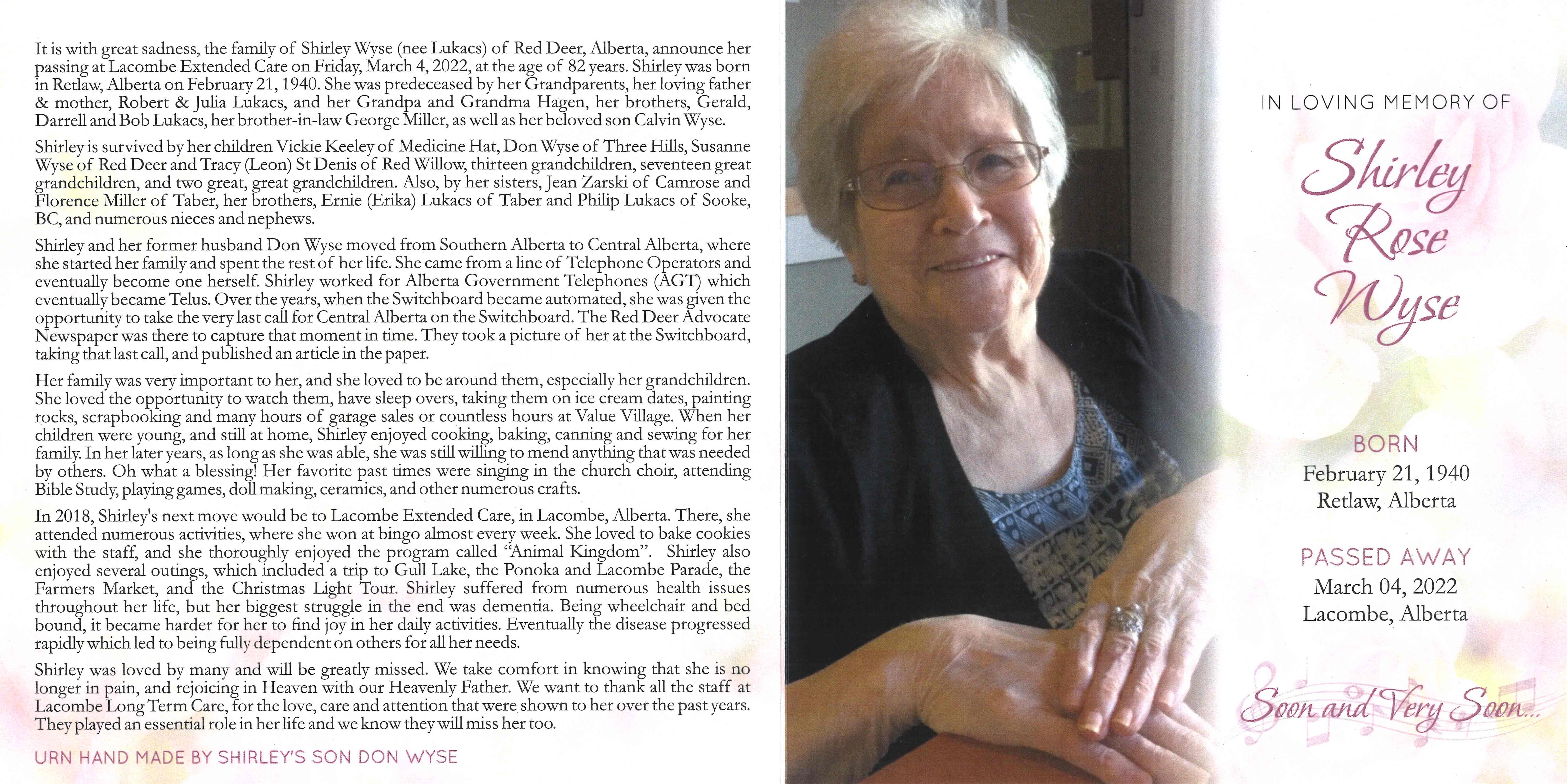 It is with great sadness, that the family of Shirley Rose Wyse (née Lukacs) of Red Deer, announce her passing in Lacombe on Friday, March 4, 2022, at the age of 82 years.
