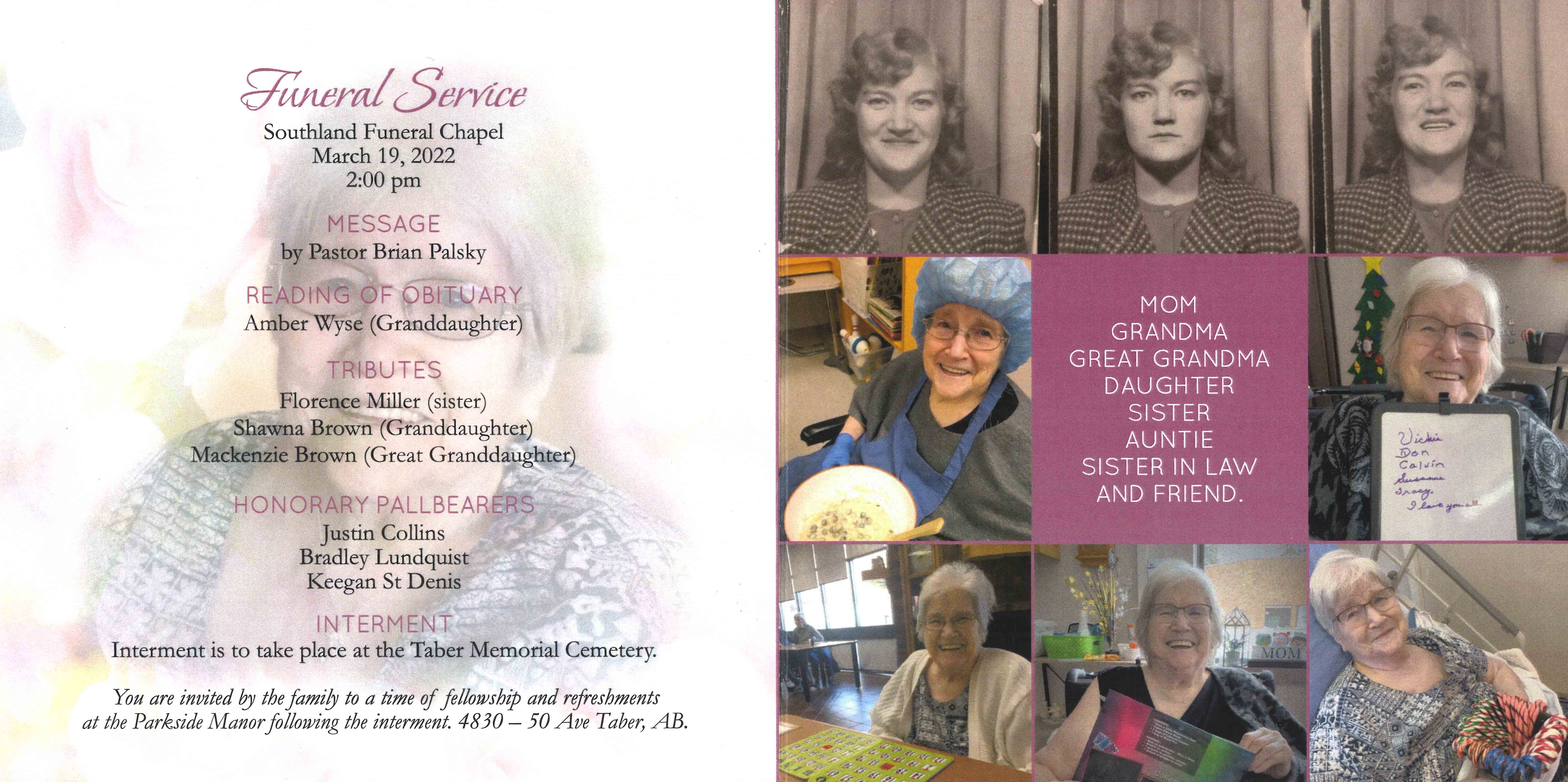 The funeral service was held at Southland Funeral Chapel, 5006 - 48 Avenue, Taber on Saturday, March 19, 2022 at 2:00 P.M. Burial followed at the Taber Memorial Garden.