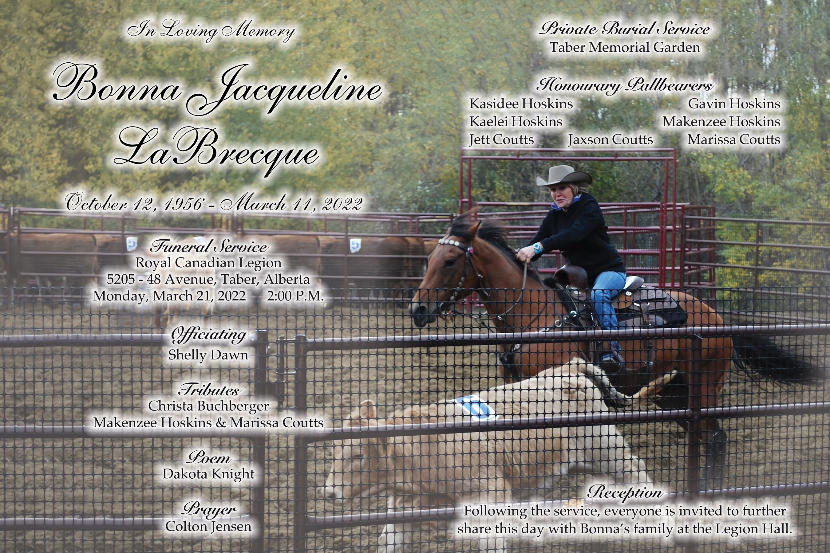 The Funeral Service was held at the Royal Canadian Legion, 5205 – 48 Avenue, Taber on Monday, March 21, 2022 at 2:00 P.M. A private burial followed at the Taber Memorial Garden.