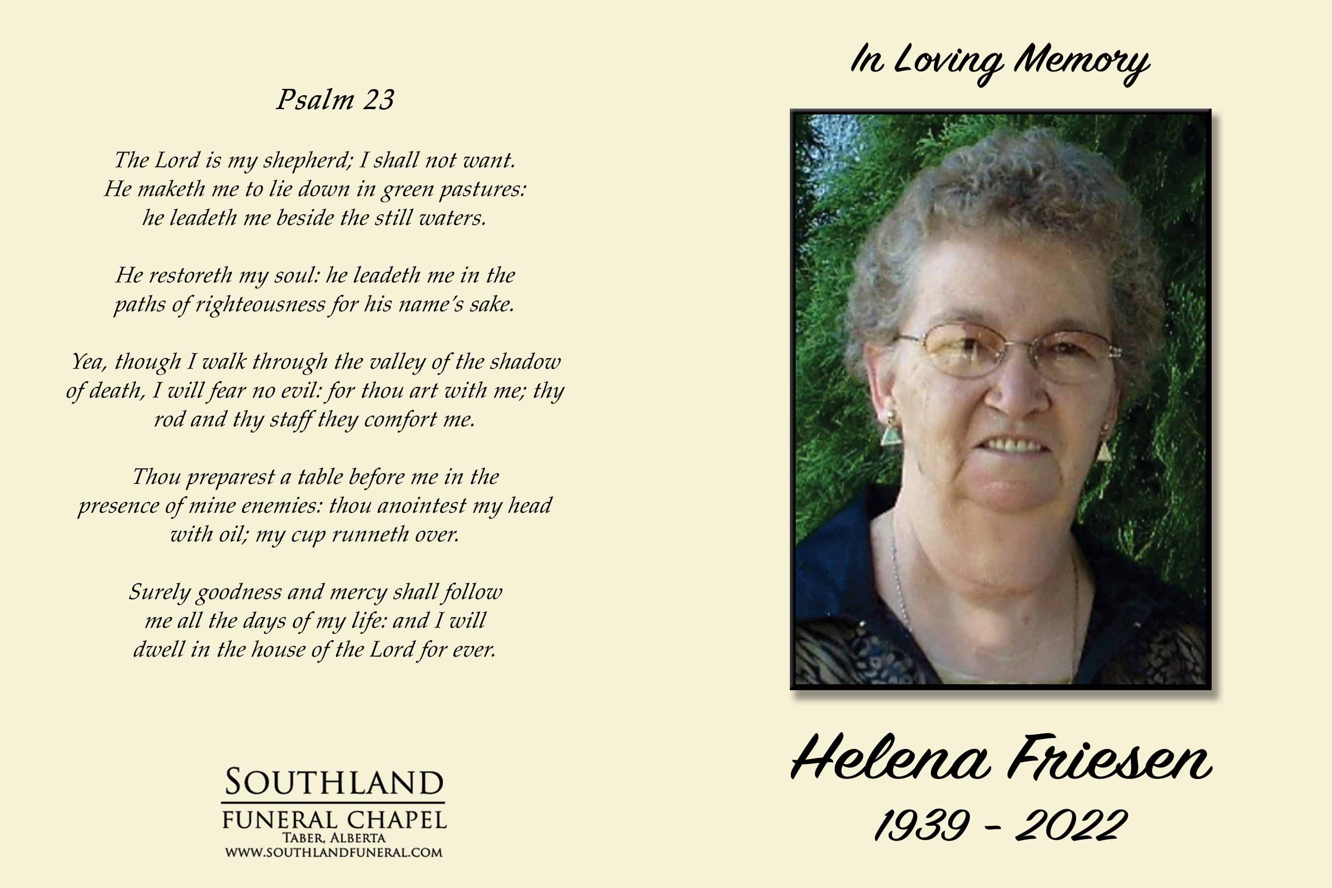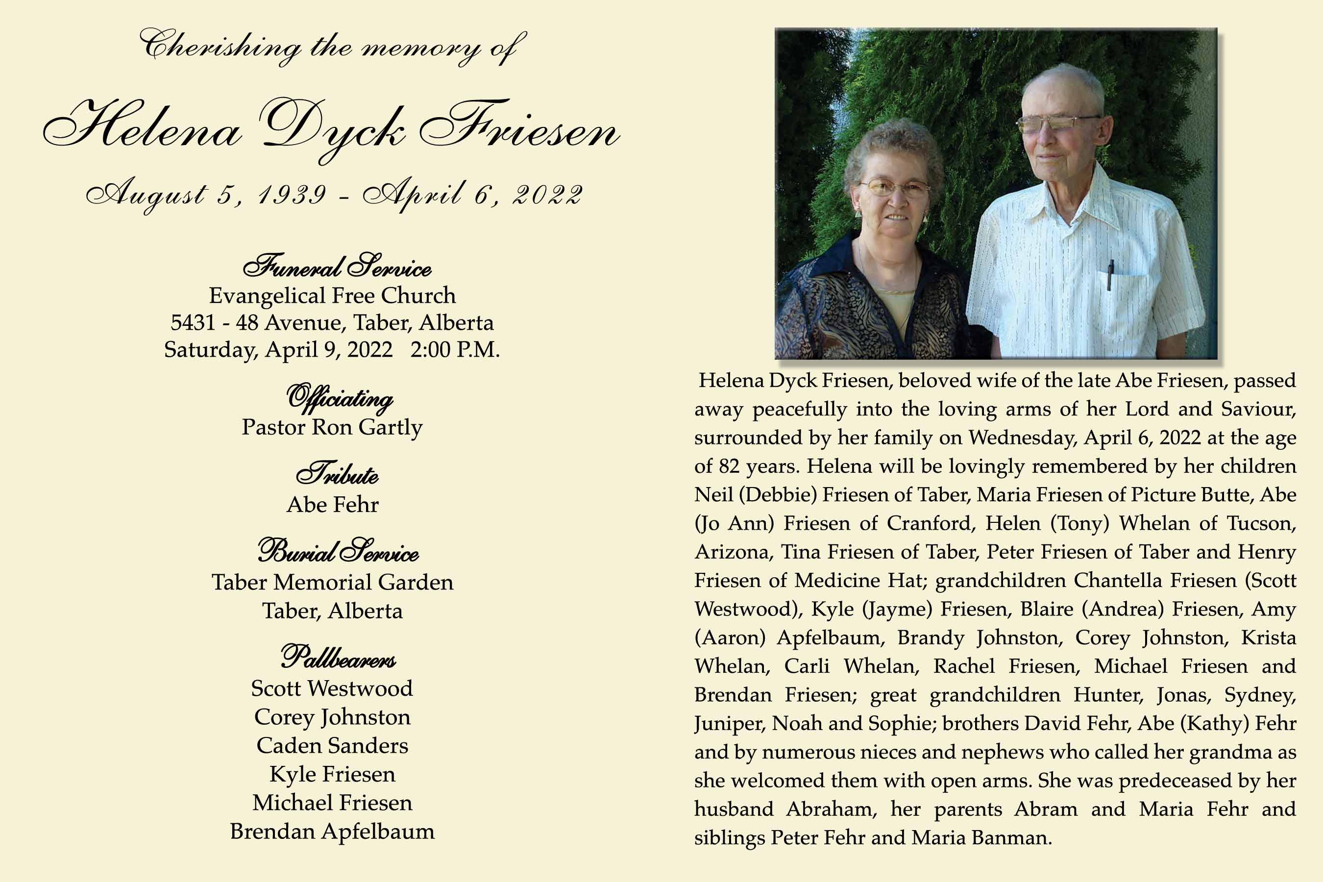 Helena will be lovingly remembered by her children Neil (Debbie) Friesen of Taber, Maria Friesen of Picture Butte, Abe (Jo Ann) Friesen of Cranford, Helen (Tony) Whelan of Tucson, Arizona, Tina Friesen of Taber, Peter Friesen of Taber and Henry Friesen of Medicine Hat; grandchildren Chantella Friesen (Scott Westwood), Kyle (Jayme) Friesen, Blaire (Andrea) Friesen, Amy (Aaron) Apfelbaum, Brandy Johnston, Corey Johnston, Krista Whelan, Carli Whelan, Rachel Friesen, Michael Friesen and Brendan Friesen; great grandchildren Hunter, Jonas, Sydney, Juniper, Noah and Sophie; brothers David Fehr, Abe (Kathy) Fehr and by numerous nieces and nephews who called her grandma as she welcomed them with open arms.