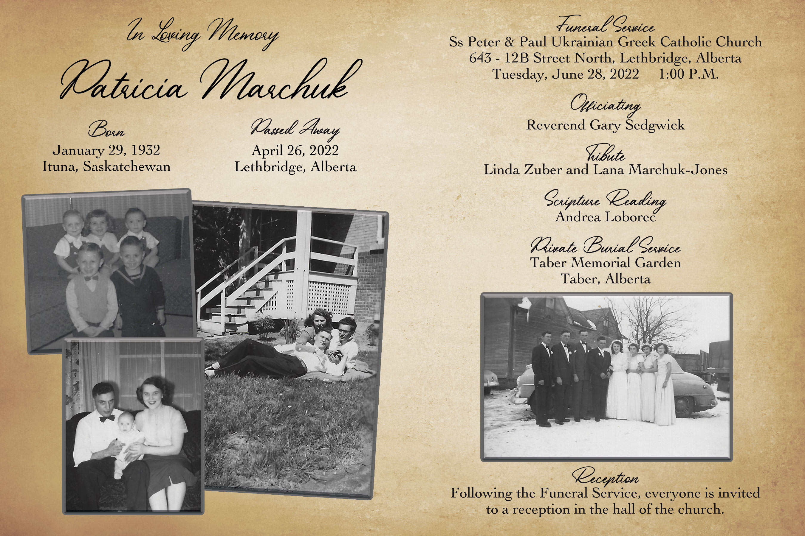 The Funeral Service was held at Ss Peter & Paul Ukrainian Greek Catholic Church, 643 - 12B Street North, Lethbridge on Tuesday, June 28, 2022 at 1:00 P.M. A private burial followed at the Taber Memorial Garden.