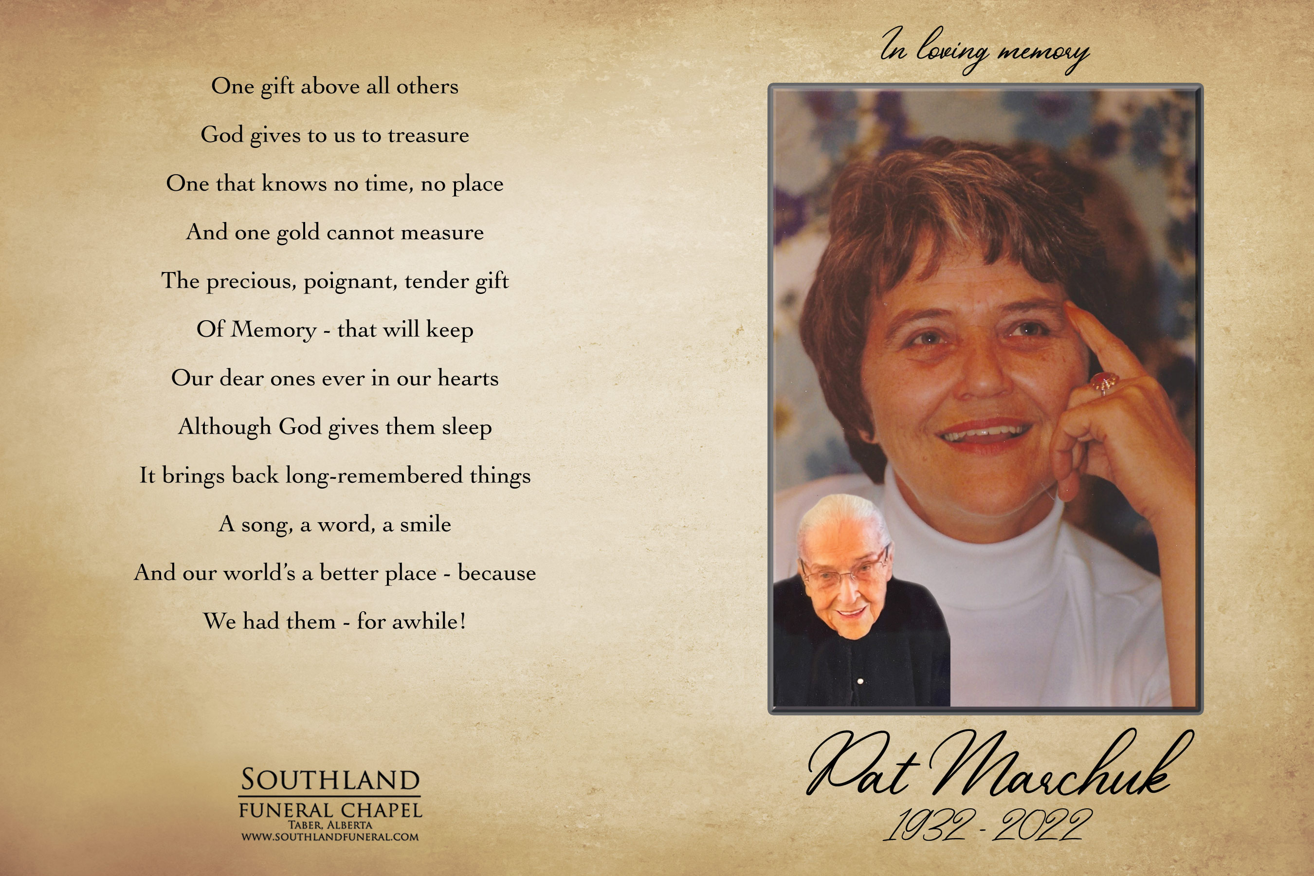 Left to cherish Pat’s memory are her sons Garry (Deborah) Marchuk of Beaver Mines, Grant Marchuk of Lethbridge, Brant Marchuk of Lethbridge and daughter Linda (Terry) Zuber of Rocky Mountain House; fourteen grandchildren and thirteen great grandchildren. She is also survived by her brother Orest (Rosalee) Dorosh, sister Iris (Dan) Karapita and numerous relatives and friends.