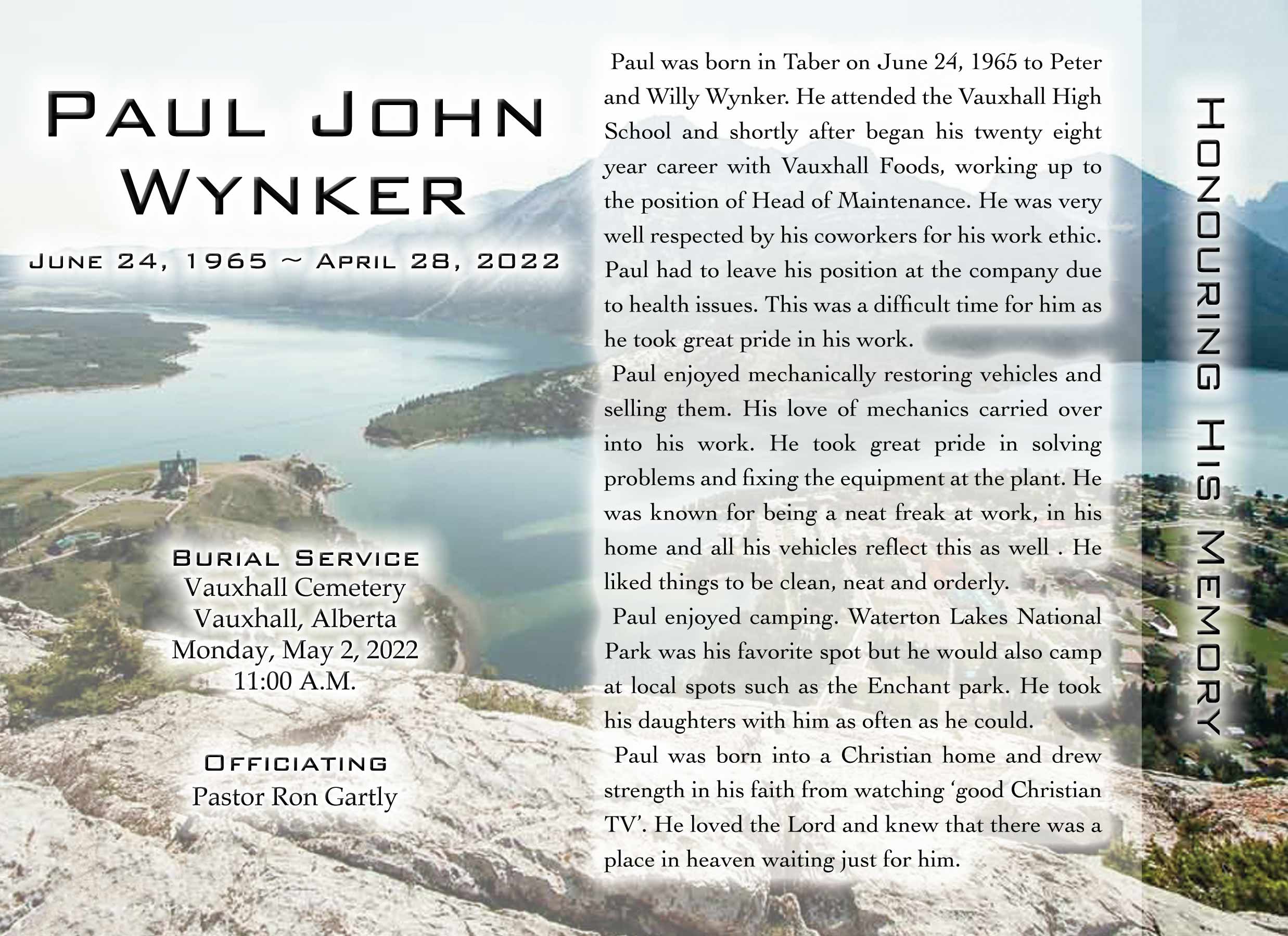 Paul was born in Taber on June 24, 1965 to Peter and Willy Wynker. He attended the Vauxhall High School and shortly after began his twenty eight year career with Vauxhall Foods, working up to the position of Head of Maintenance. He was very well respected by his coworkers for his work ethic. Paul had to leave his position at the company due to health issues. This was a difficult time for him as he took great pride in his work.
