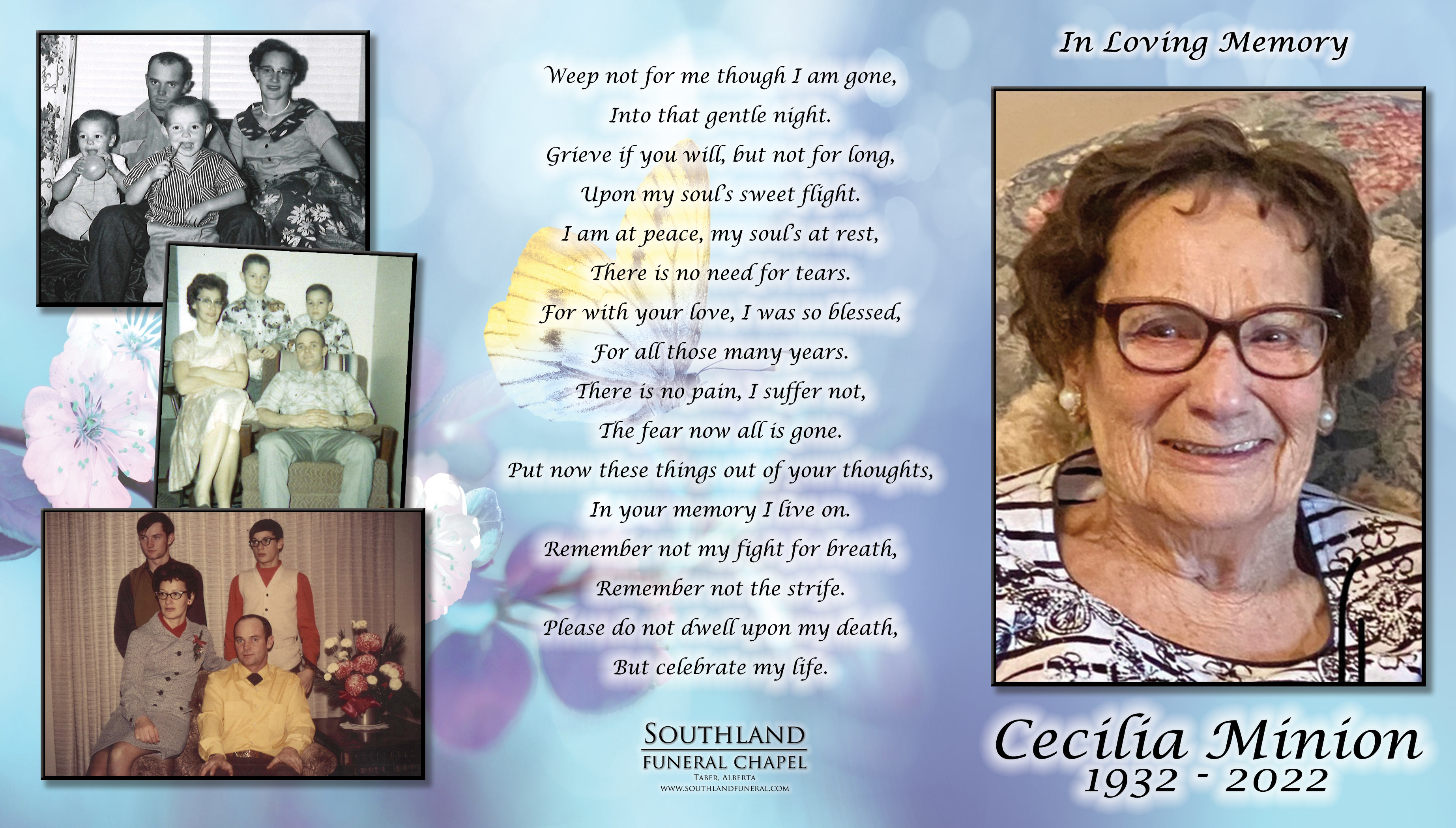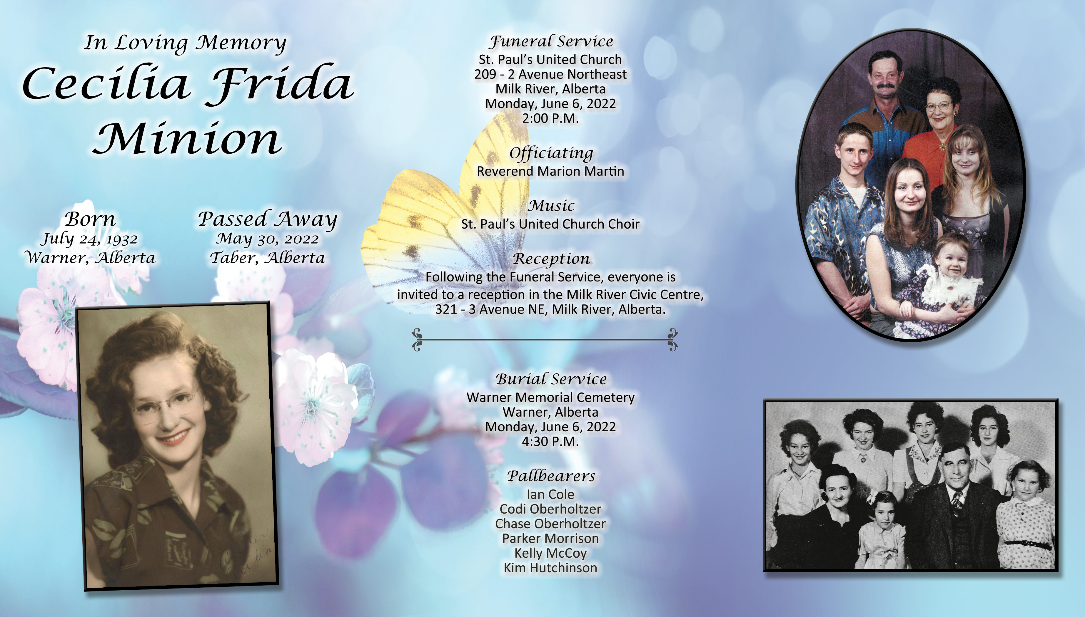 Cecilia Frida Minion, beloved wife of the late Lee Minion, passed away in Taber on Monday, May 30, 2022 at the age of 89 years.