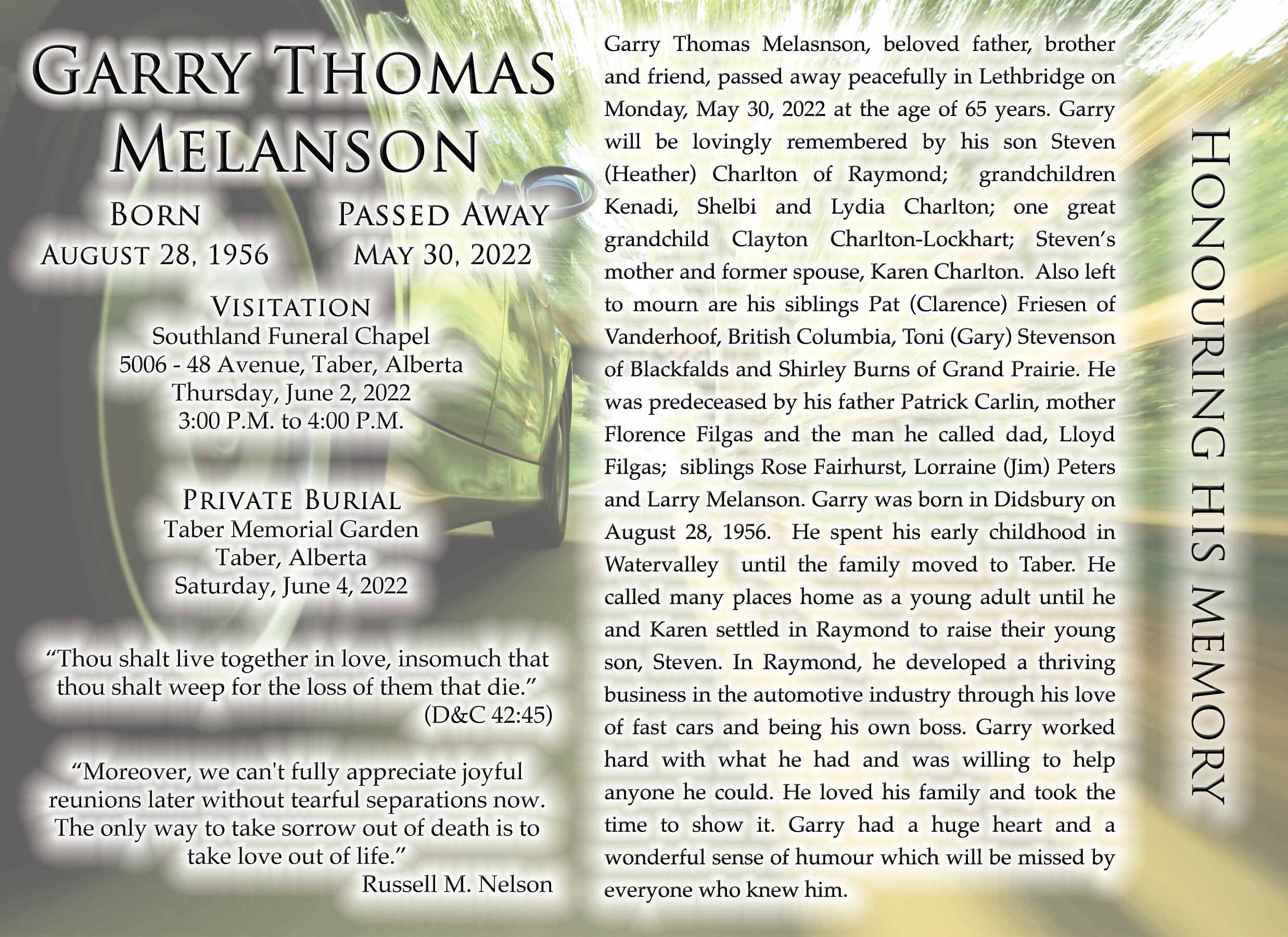 Garry Thomas Melanson, beloved father, brother and friend, passed away peacefully in Lethbridge on Monday, May 30, 2022 at the age of 65 years.