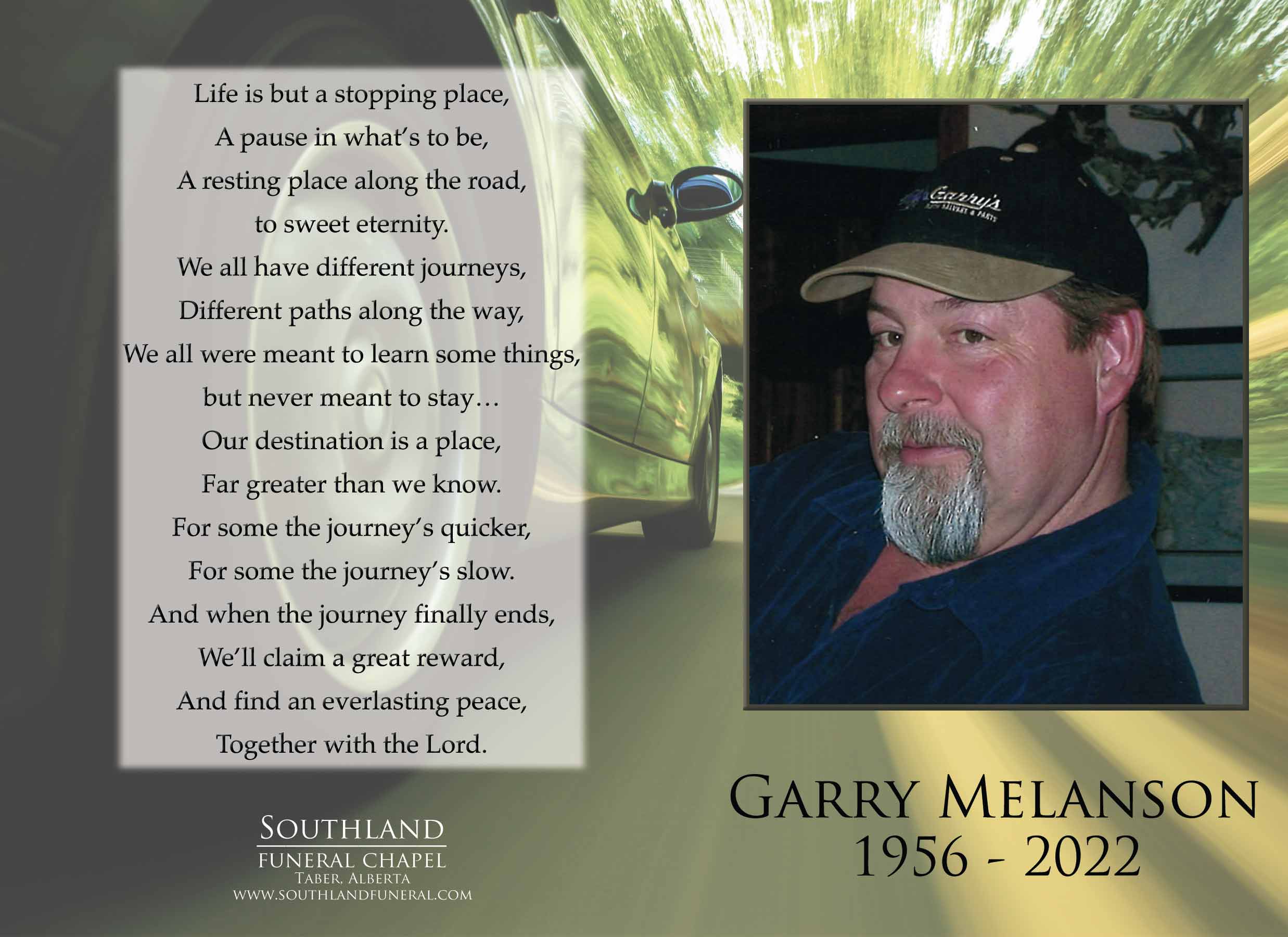 Garry was born in Didsbury on August 28, 1956. He spent his early childhood in Watervalley until the family moved to Taber. He called many places home as a young adult until he and Karen settled in Raymond to raise their young son, Steven. In Raymond, he developed a thriving business in the automotive industry through his love of fast cars and being his own boss. Garry worked hard with what he had and was willing to help anyone he could. He loved his family and took the time to show it. Garry had a huge heart and a wonderful sense of humour which will be missed by everyone who knew him.