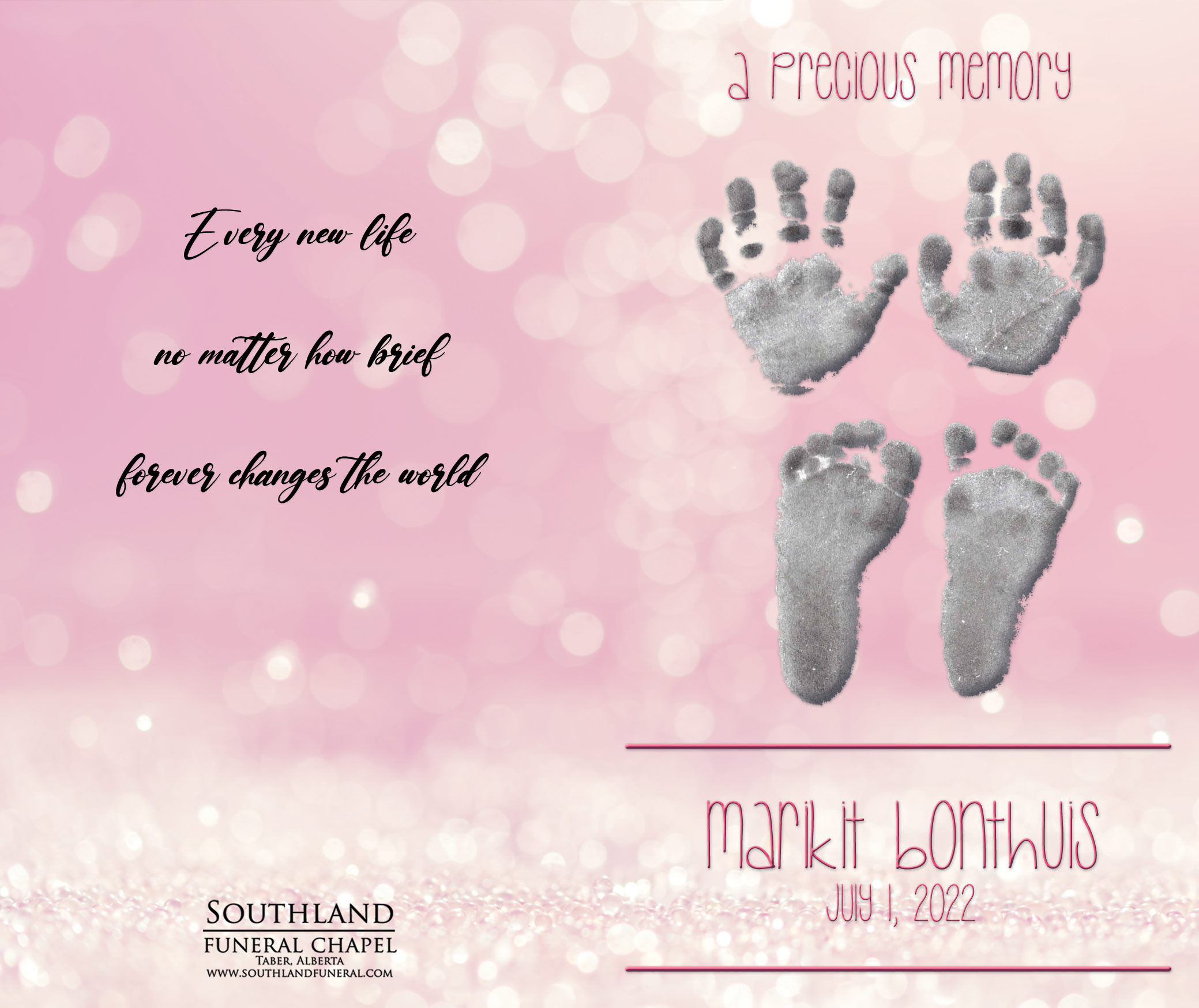 Marikit Bonthuis, beloved infant daughter of Vyne and Tim Bonthuis, passed away in Lethbridge on Friday, July 1, 2022.