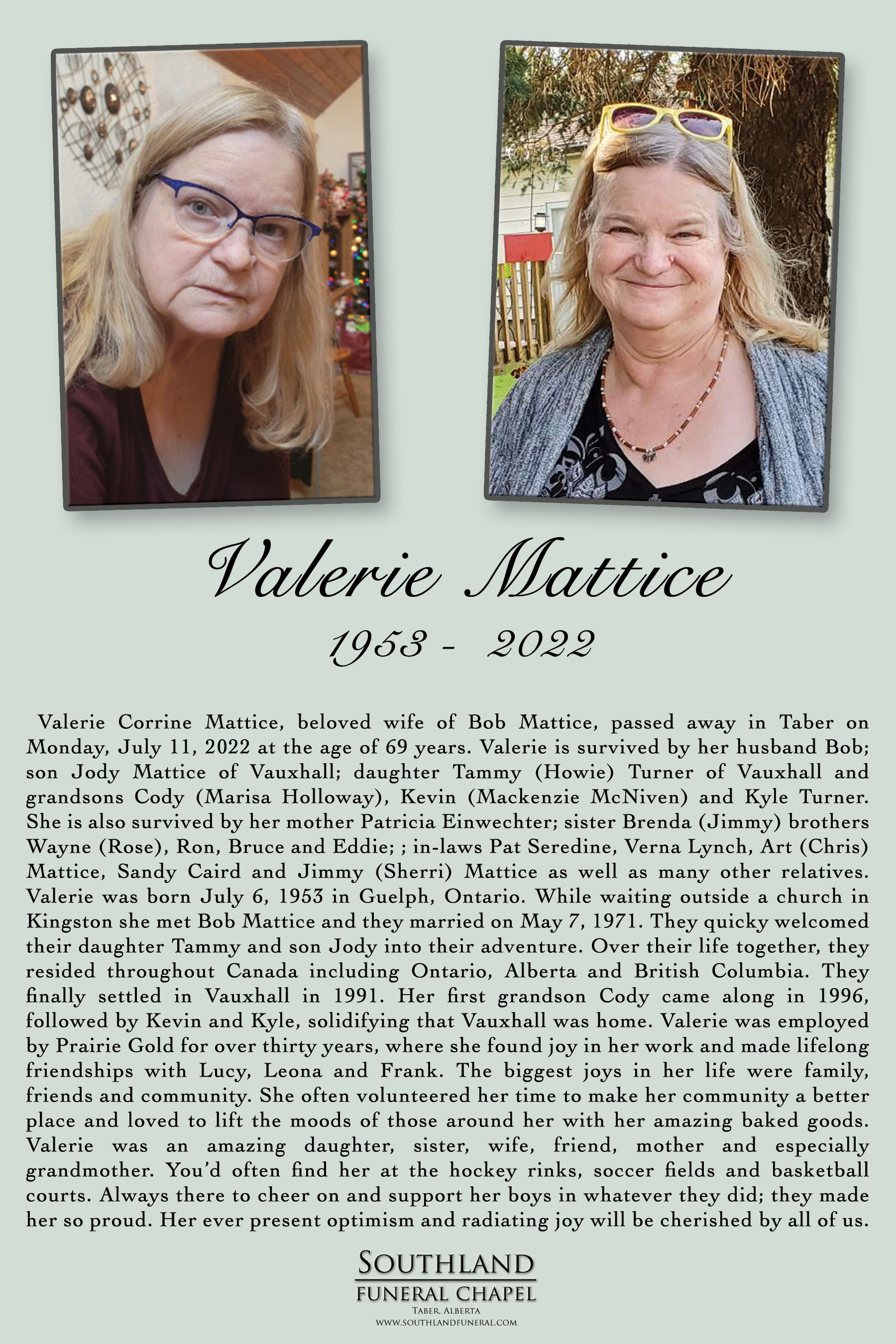 Valerie was born July 6, 1953 in Guelph, Ontario. While waiting outside a church in Kingston she met Bob Mattice and they married on May 7, 1971. They quicky welcomed their daughter Tammy and son Jody into their adventure. Over their life together, they resided throughout Canada including Ontario, Alberta and British Columbia. They finally settled in Vauxhall in 1991. Her first grandson Cody came along in 1996, followed by Kevin and Kyle, solidifying that Vauxhall was home.