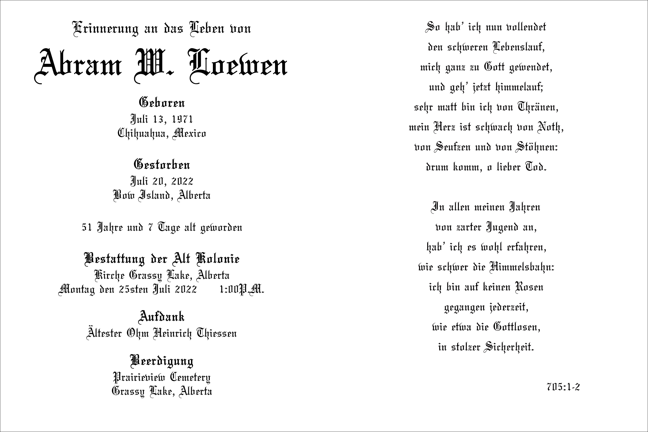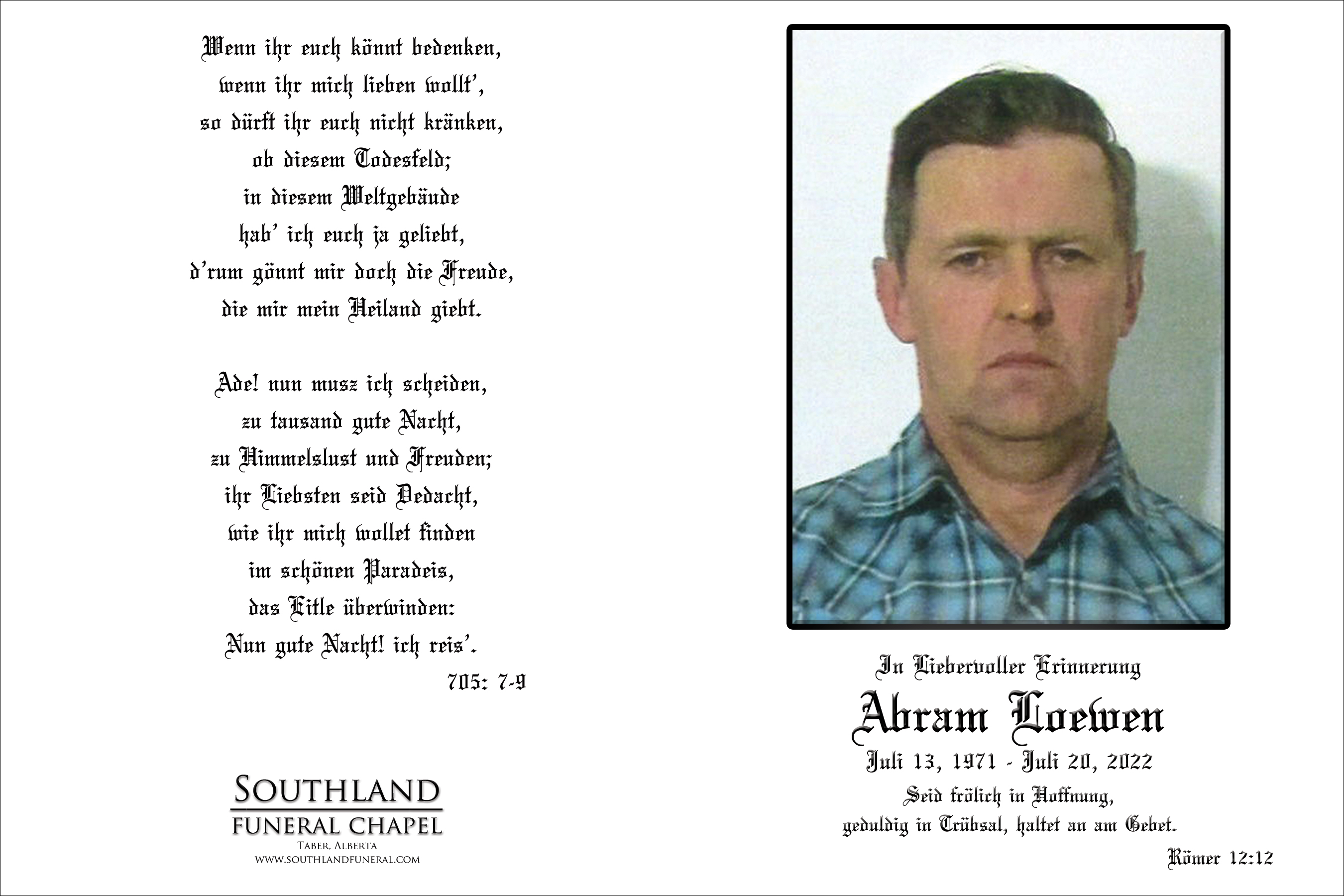 Abram Wall Loewen, beloved husband of Aganetha Loewen, passed away in Bow Island on Wednesday, July 20, 2022 at the age of 51 years.
