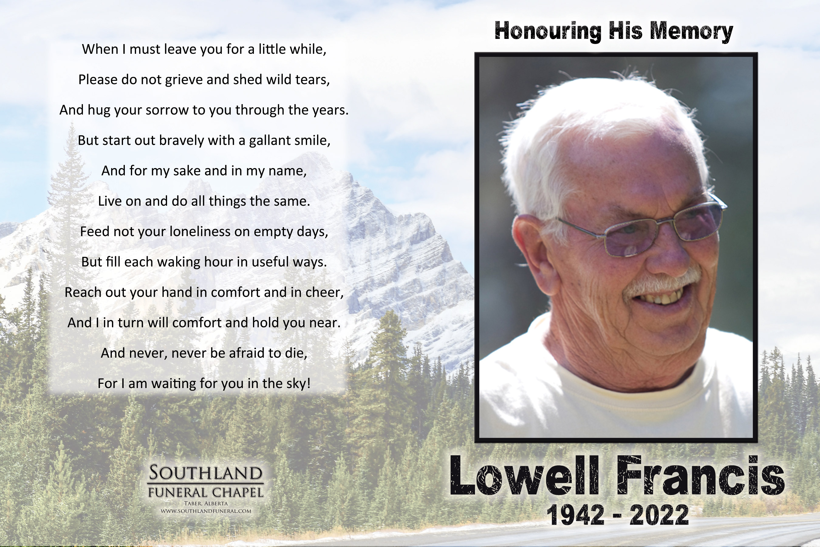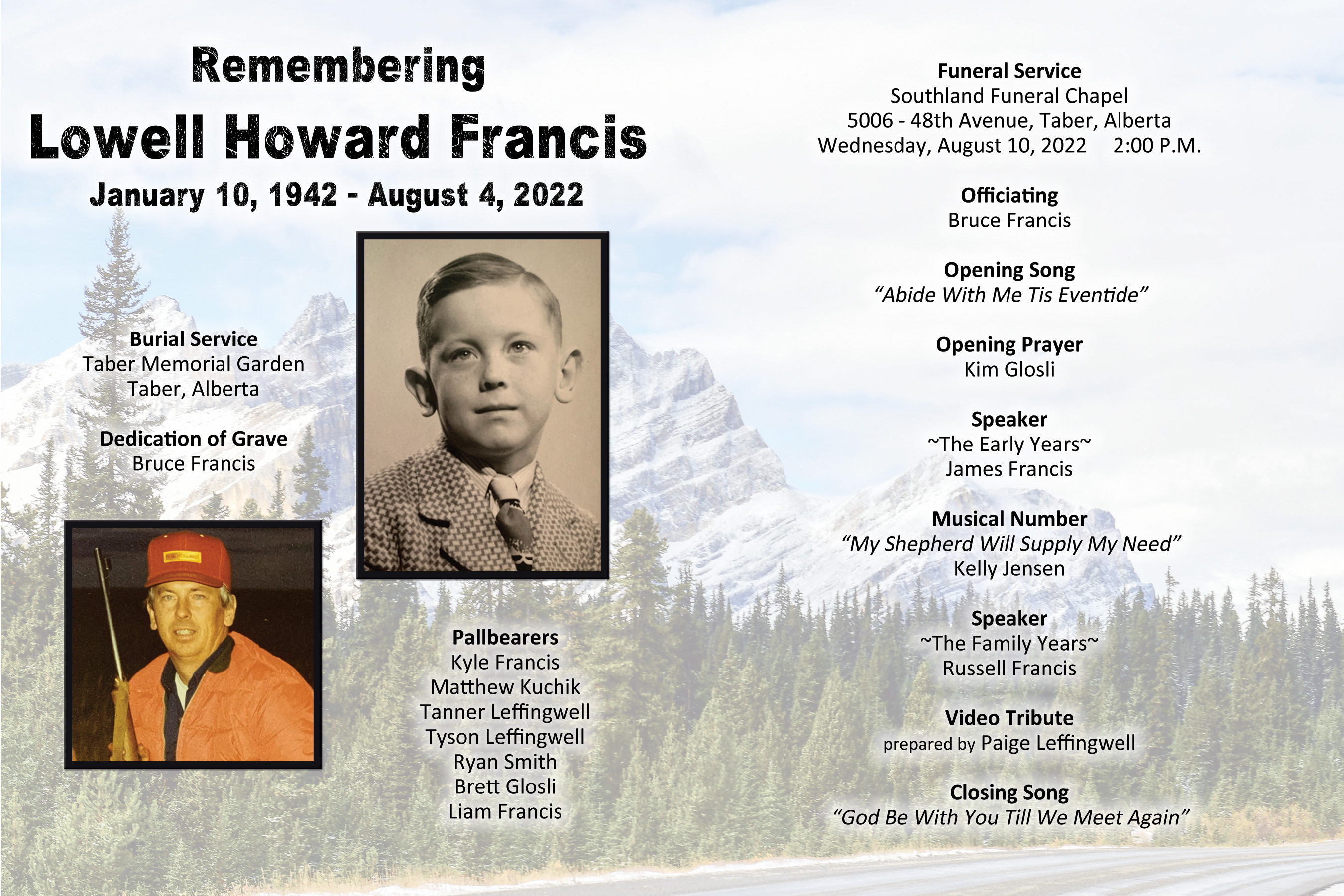 A private Funeral Service was held at Southland Funeral Chapel, Taber on Wednesday, August 10, 2022. A private burial followed at the Taber Memorial Garden.