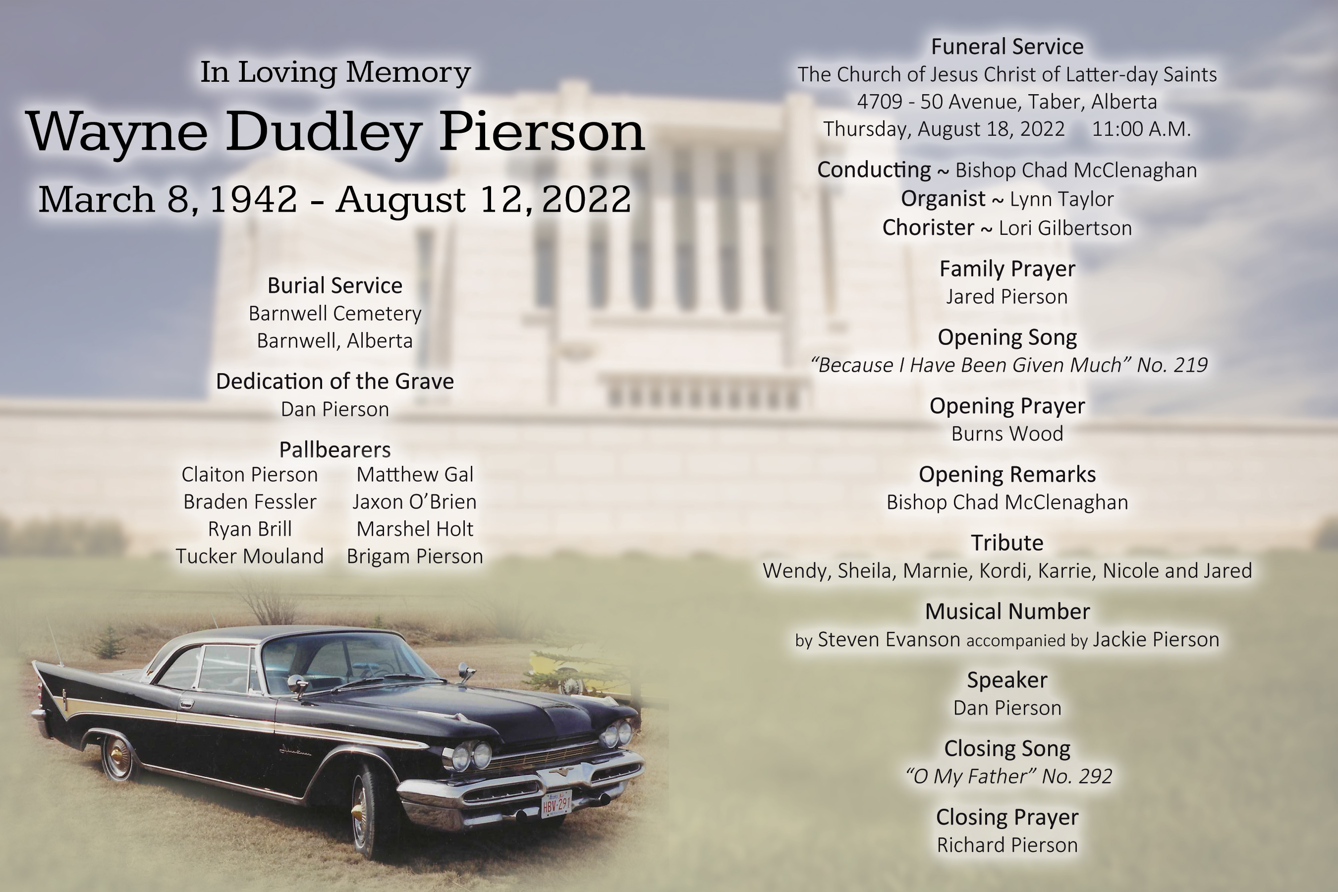 Wayne Dudley Pierson, beloved husband of Joan Pierson, passed away in Taber on Friday, August 12, 2022 at the age of 80 years.