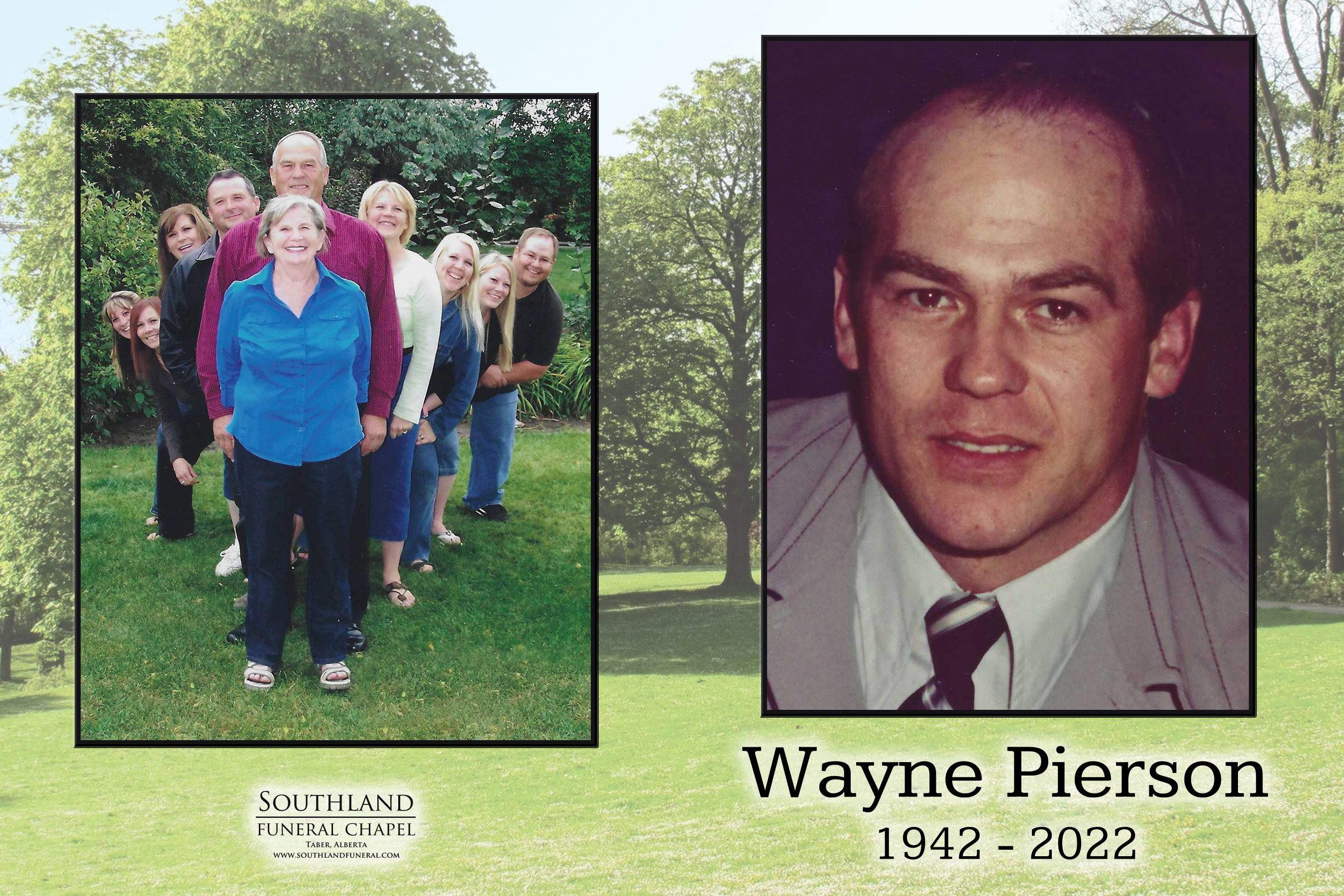 Wayne was born on March 8, 1942 to Clifford and Viola Pierson. He was the fifth of seven children. Wayne married the love of his life Joan April Evanson on September 5, 1960. Together they raised eight children, Dan (Jackie) Pierson, Wendy (Lyndon) Layton, Sheila (Luke) Girouard, Marnie (Garth) Mouland, Kordi (Brad) Gal, Karrie (Mike) O’Brien, Nicole Pierson and Jared (Berry Ann) Pierson.