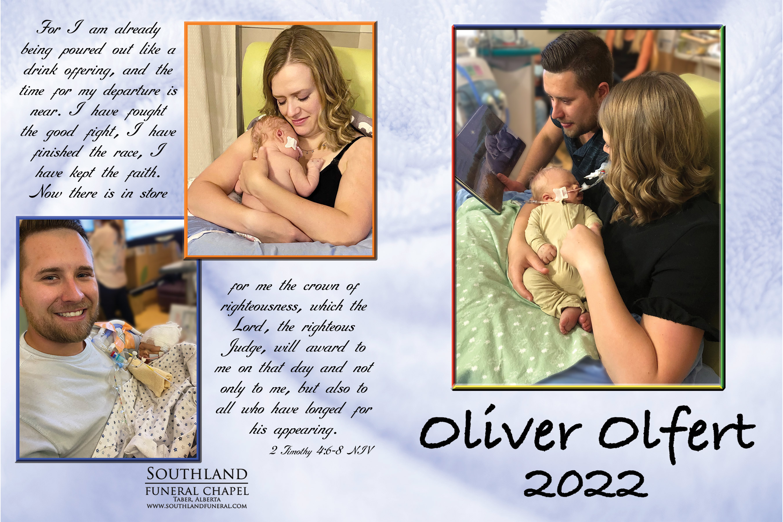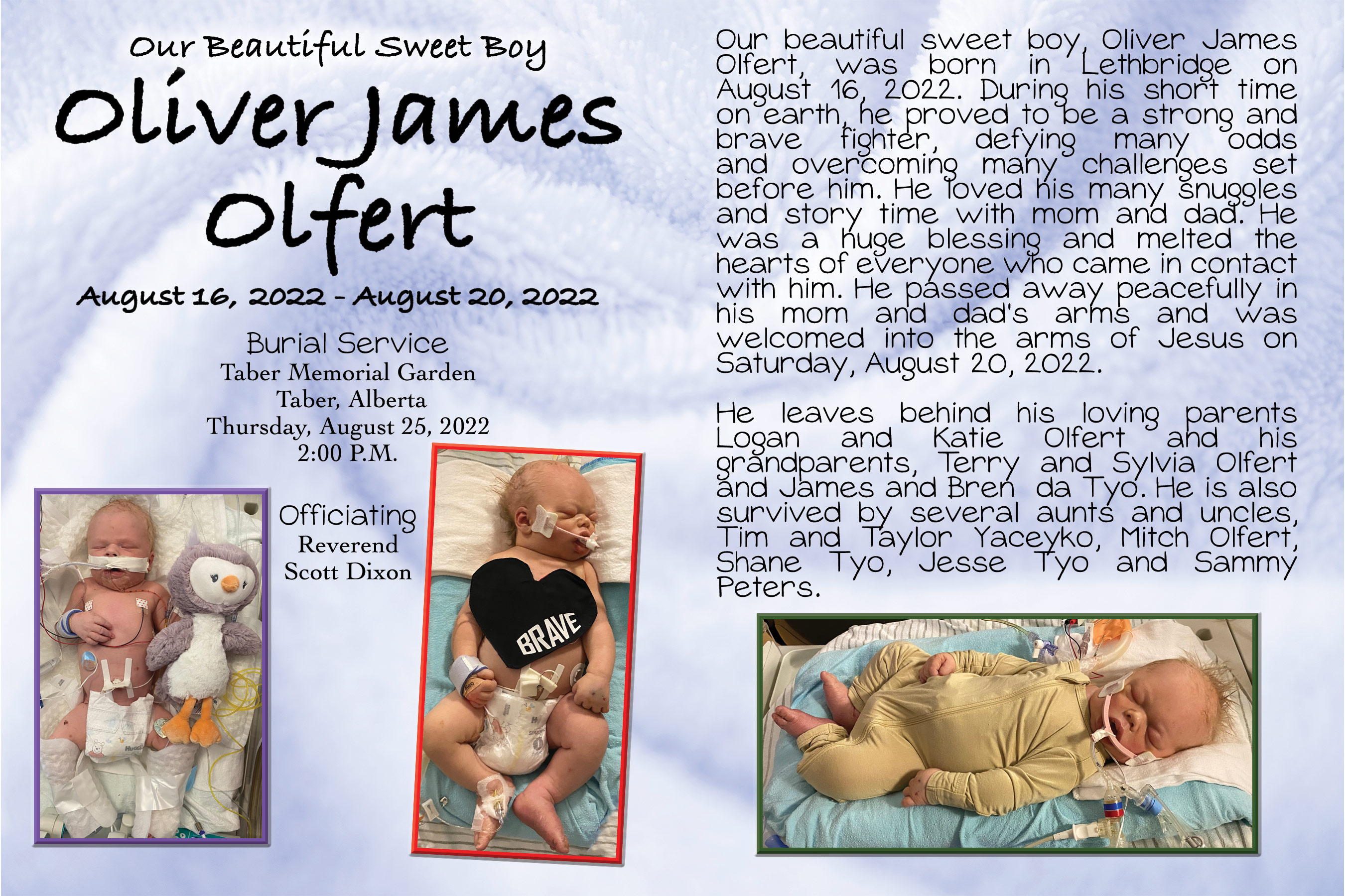 Our beautiful sweet boy, Oliver James Olfert, was born in Lethbridge on August 16, 2022. During his short time on earth, he proved to be a strong and brave fighter, defying many odds and overcoming many challenges set before him. He loved his many snuggles and story time with mom and dad. He was a huge blessing and melted the hearts of everyone who came in contact with him. He passed away peacefully in his mom and dad’s arms and was welcomed into the arms of Jesus on Saturday, August 20, 2022.