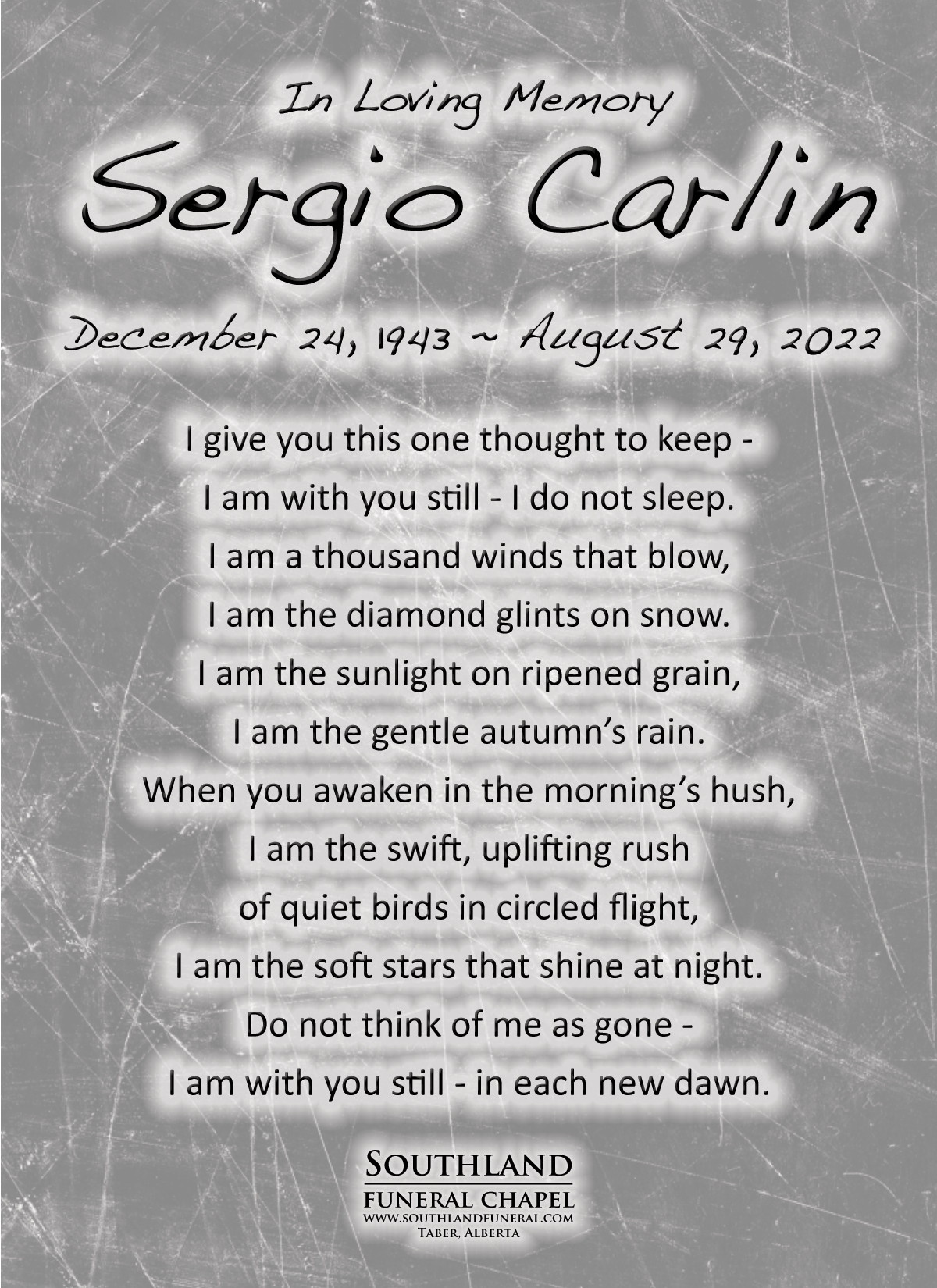 Sergio is survived by his wife Judy and their son Sean, both of Taber. He’s also survived by his brothers Luciano (Cheryl) Carlin of Taber and their children Paul, James, Anna and their families; Sylvano (Shauneen) Carlin of Taber and their children Cory, Kimberly and their families; Niece and nephews Maurice, Patricia and Robert Bernardi of Vancouver, British Columbia and their families.