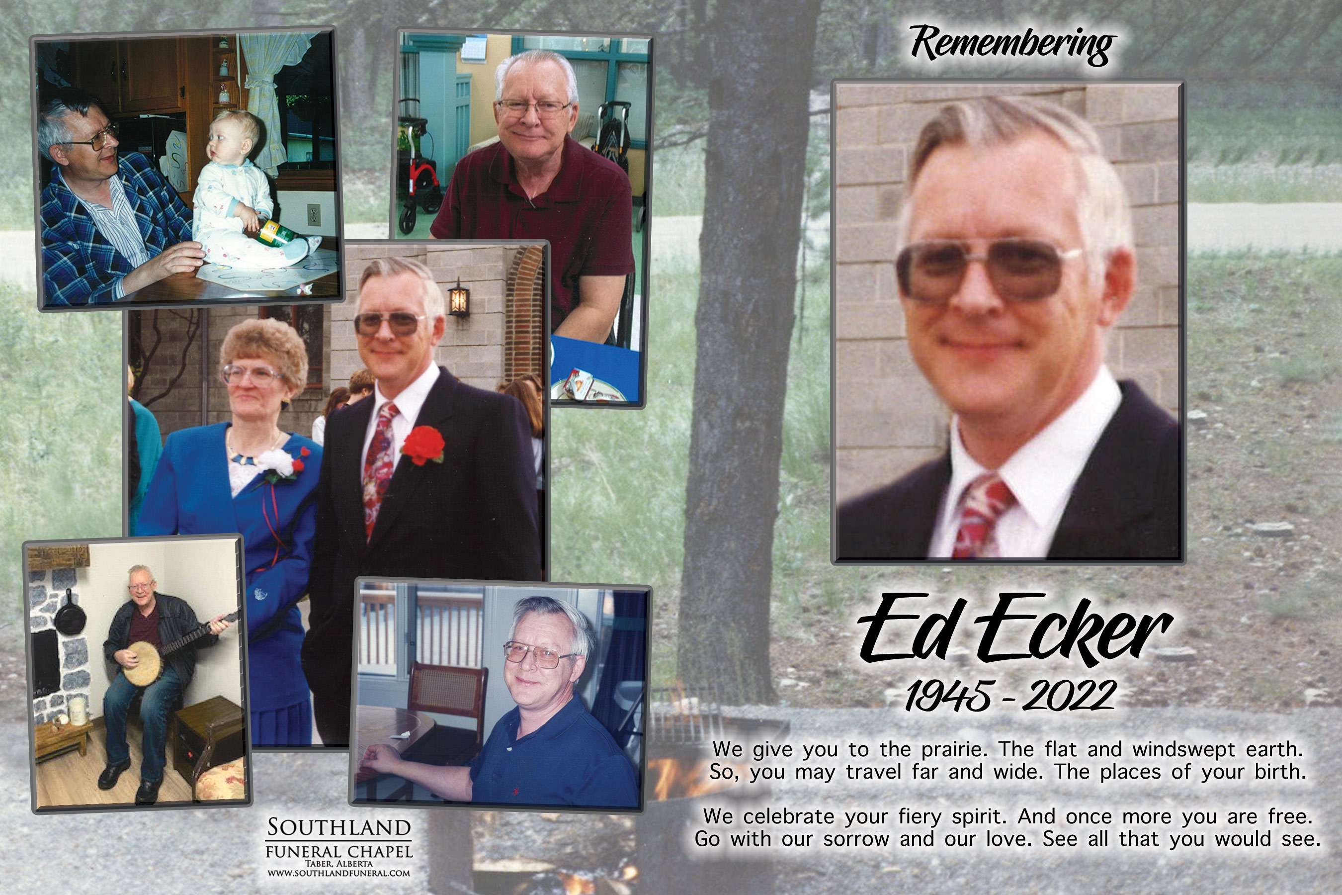 Ed is survived by his children Arthur Ecker of Coaldale, Angela (William) Smith of Calgary, Delvina (Terry) Neil of Lethbridge, Sandra Ecker (Mariko Johnson) of Calgary and by one grandson, William Smith. He is also survived by numerous nieces and nephews.