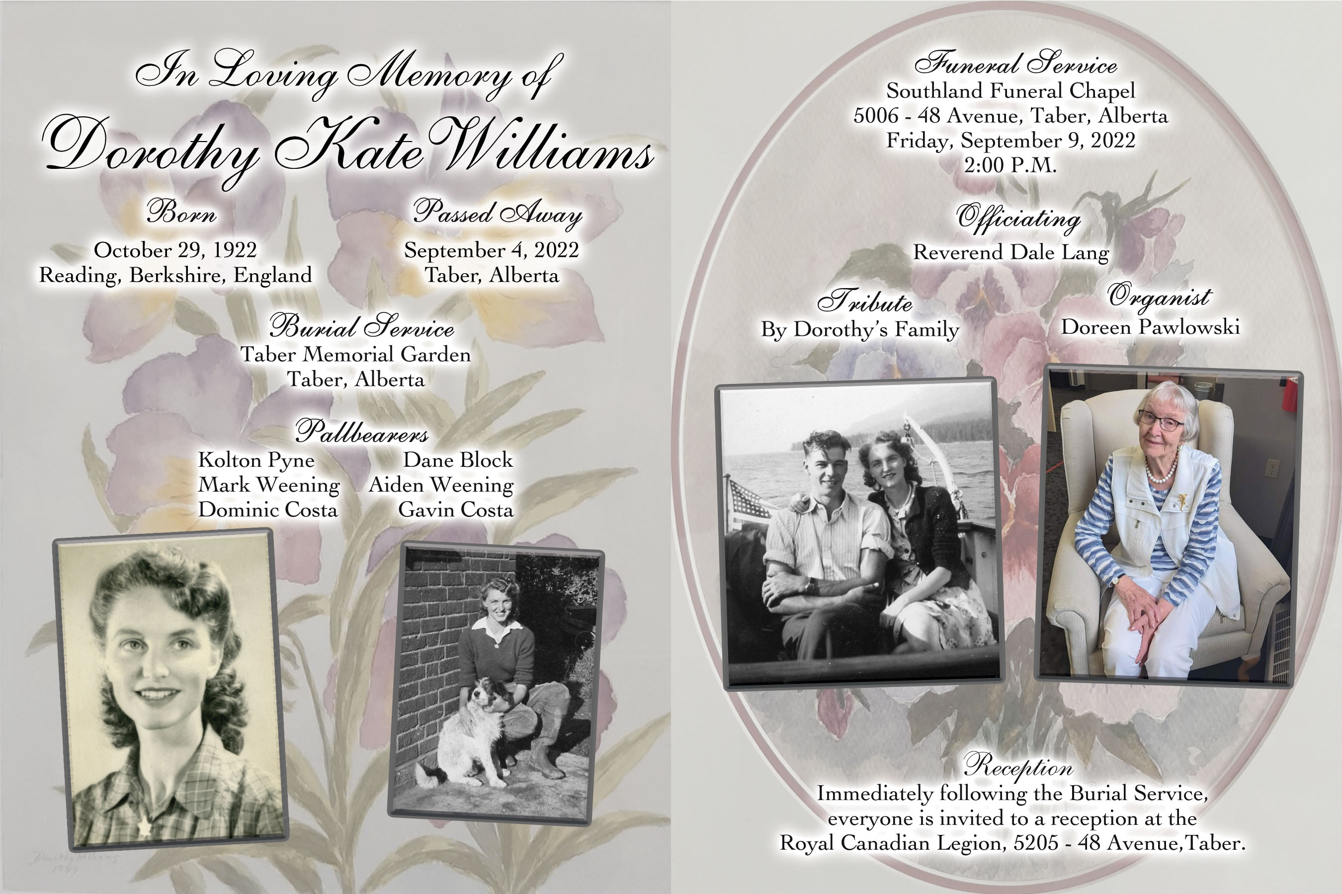 If friends so desire, memorial tributes in Dorothy’s name may be made directly to Royal Canadian Legion Branch 20, 5205 - 48 Avenue, Taber, Alberta T1G 1S8.