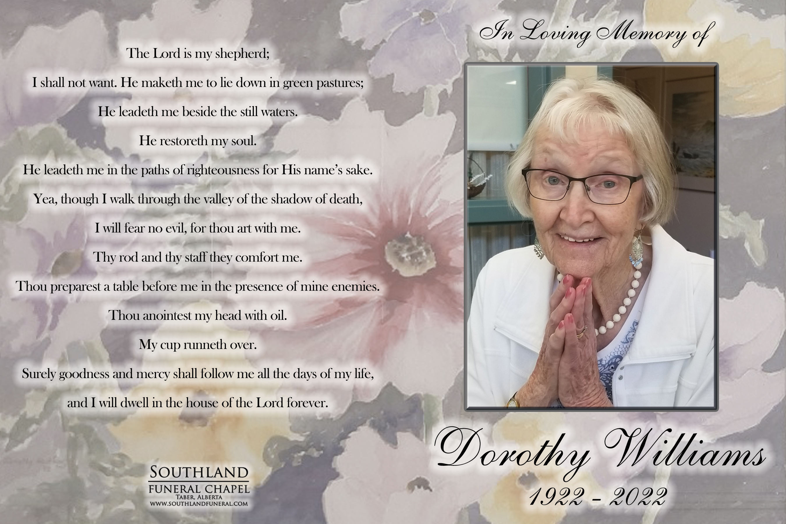 The Funeral Service was held at Southland Funeral Chapel, 5006 - 48 Avenue, Taber on Friday, September 9, 2022 at 2:00 P.M. Burial followed at the Taber Memorial Garden.
