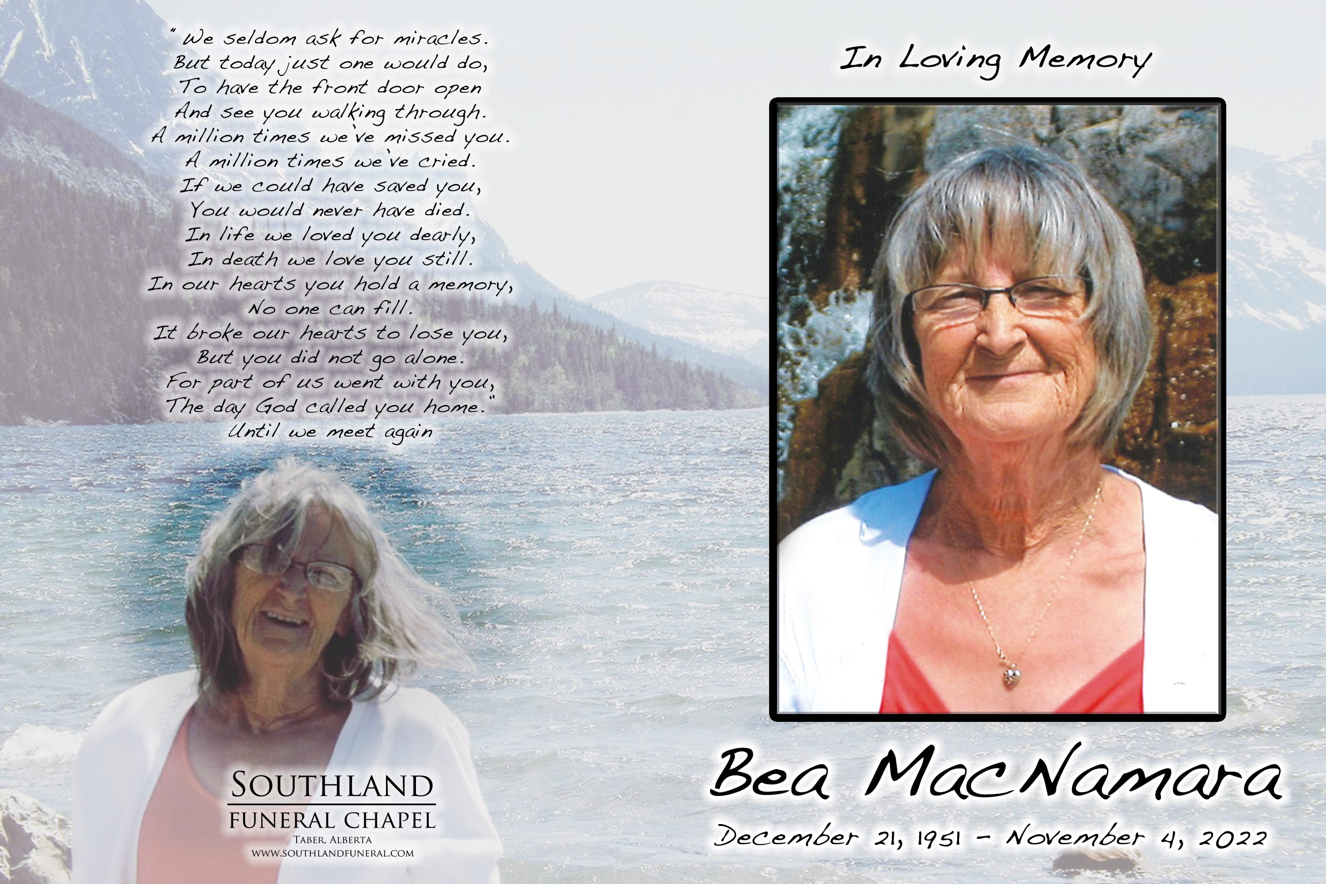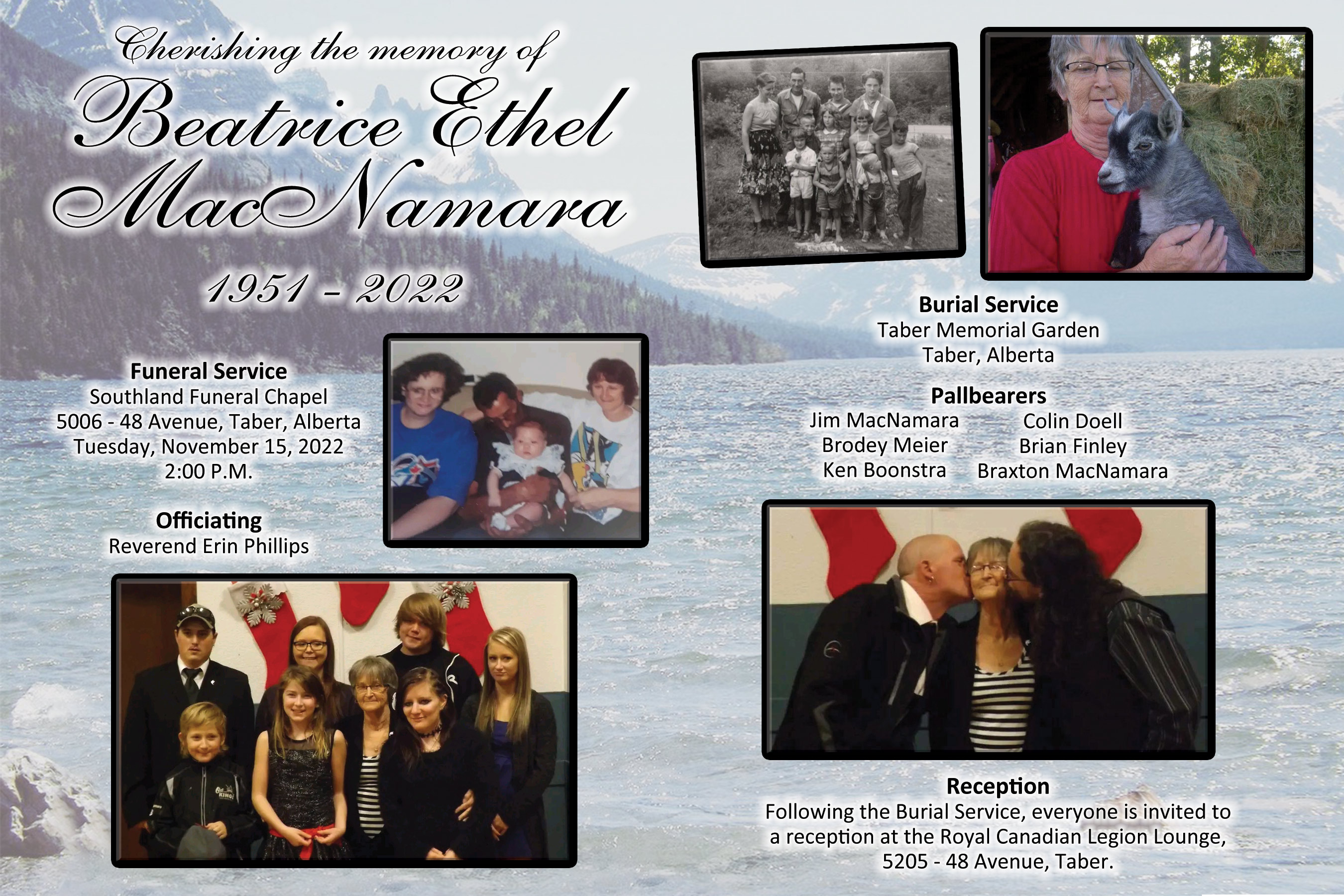 Relatives and friends were invited to meet with the family at Southland Funeral Chapel, 5006 - 48 Avenue, Taber on Monday, November 14, 2022 between 7:00 P.M. and 8:00 P.M.