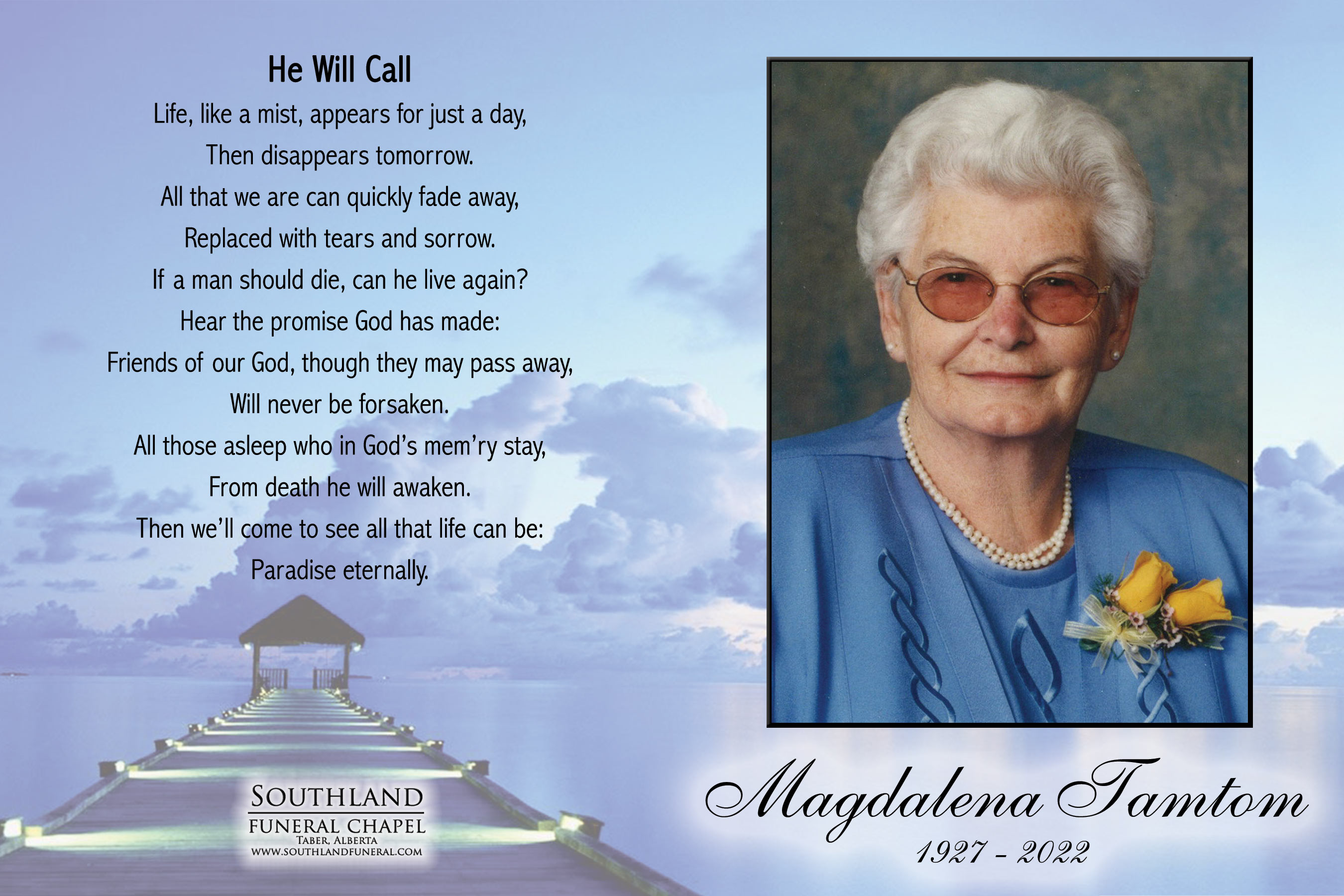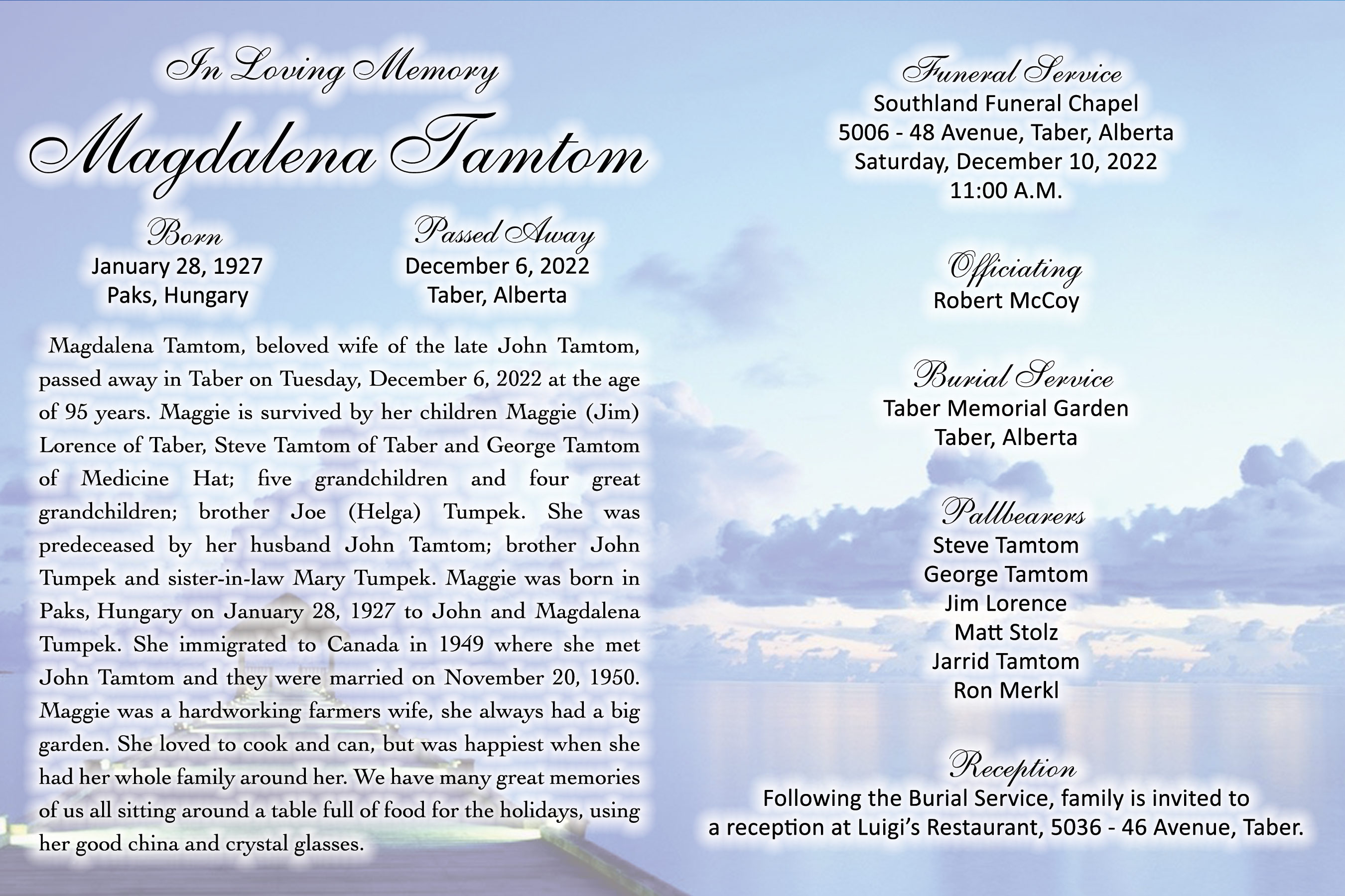 Magdalena Tamtom, beloved wife of the late John Tamtom, passed away in Taber on Tuesday, December 6, 2022 at the age of 95 years.