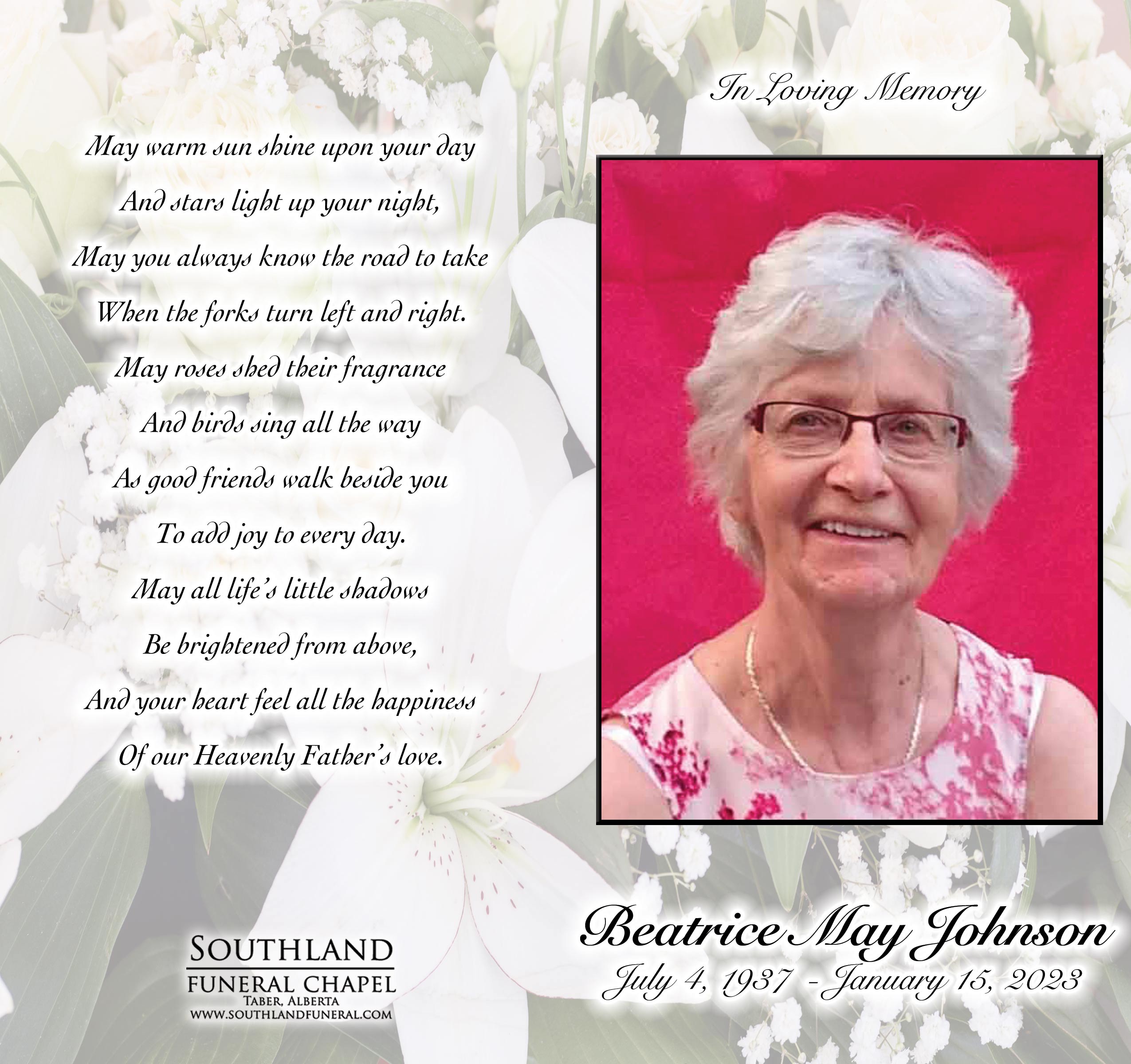 Beatrice May Johnson of Black Rock Terrace, Lethbridge, passed away and went to be with her Lord and Savior on Sunday, January 15, 2023 at the age of 85 years.
