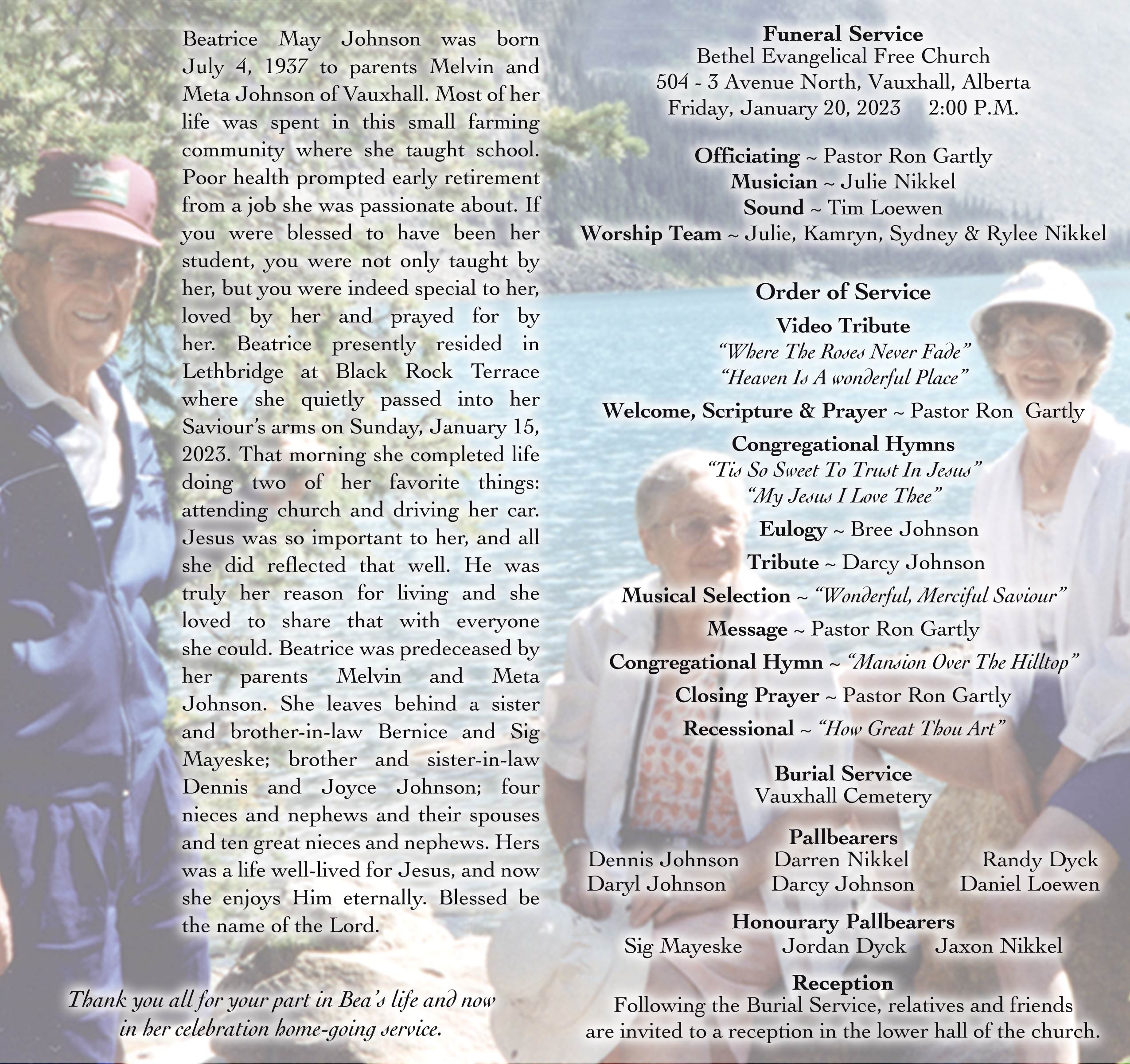 The Funeral Service was held at the Bethel Evangelical Free Church, 504 - 3 Avenue, Vauxhall on Friday, January 20, 2023 at 2:00 P.M. Burial followed at the Vauxhall Cemetery.