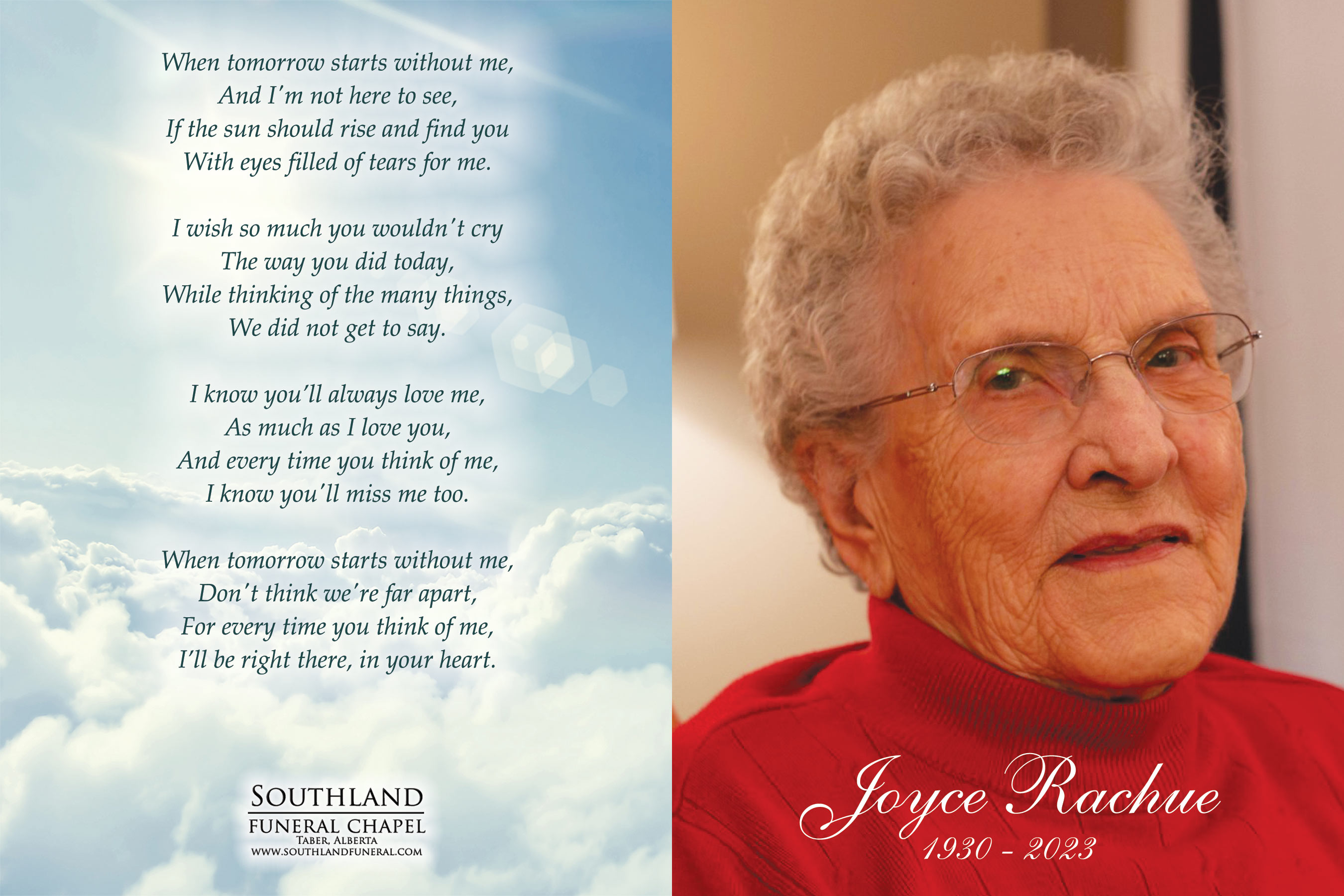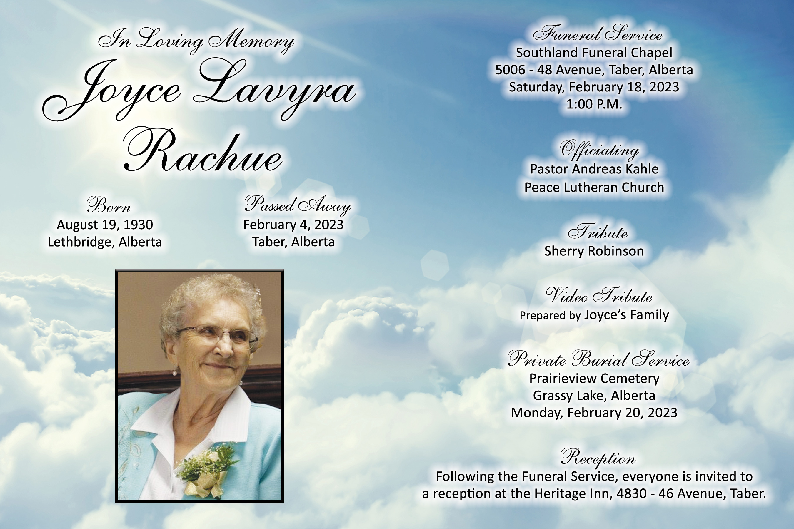Joyce was born on August 19, 1930 in Lethbridge, the only daughter of Lula and William Reber. On January 7, 1948, Joyce married Bill Rachue and for the next number of years worked in the cook house for the trucking company Bill worked for hauling gravel. Trucking was a job which took the family all over Alberta as well as into Saskatchewan. In 1955 Joyce and Bill bought their farm northwest of Grassy Lake where they continued to farm until retiring in 1977 to the town of Grassy Lake. In 2002 they recognized that the time had come for another move, and they moved into Pioneer Place in Taber. Bill passed away in 2008 and Joyce moved into Clearview Lodge in 2013 where she resided until recently when she moved to Linden View care facility.