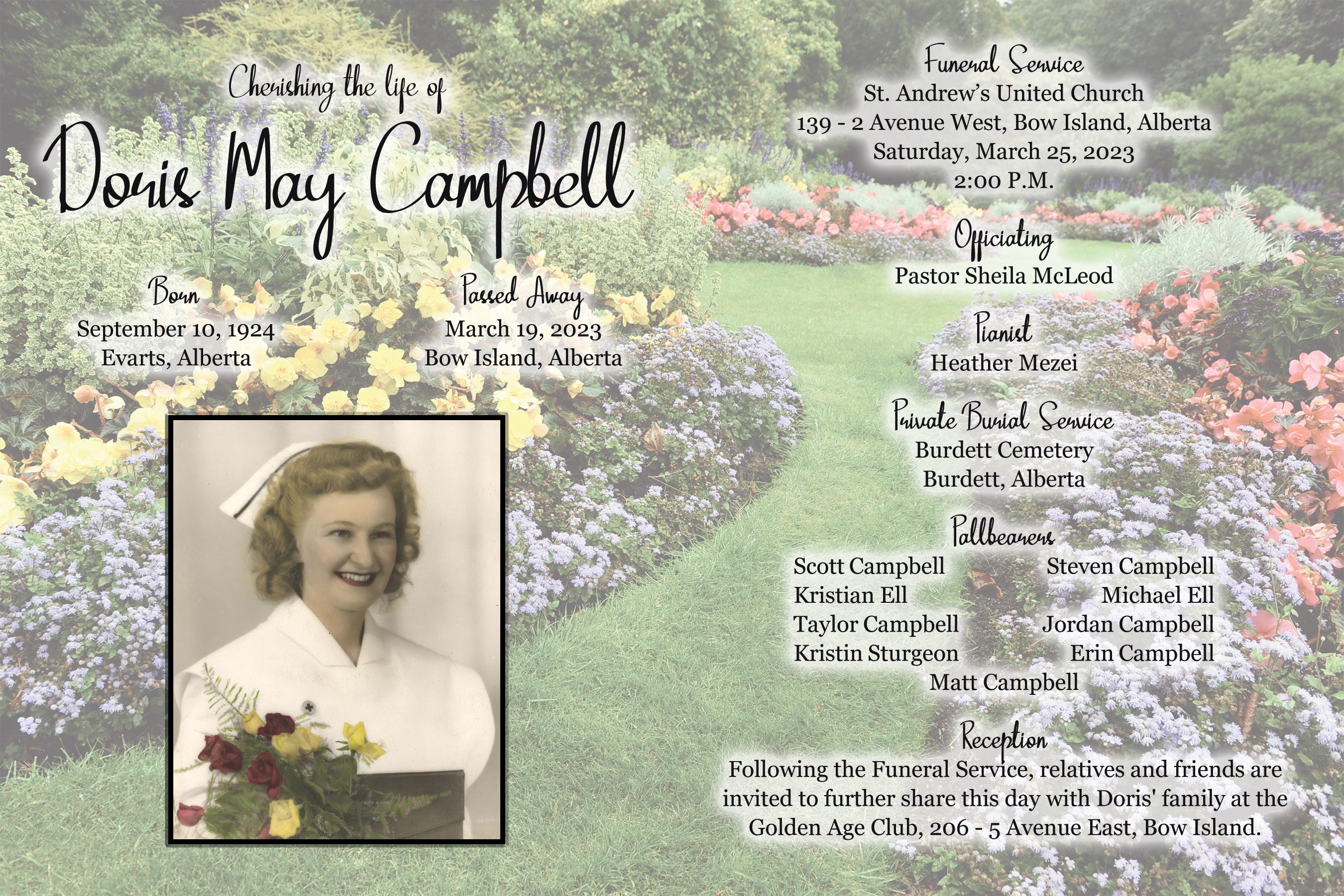 The Funeral Service was held at St. Andrew's United Church, 139 - 2 Avenue West, Bow Island on Saturday, March 25, 2023 at 2:00 P.M.