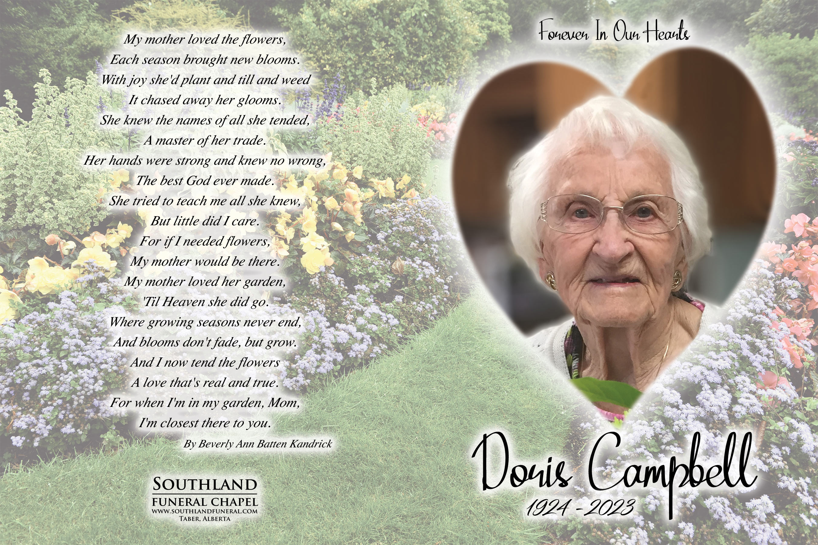 Doris is survived by her children Dale (Gloria) Campbell of Sylvan Lake, Cheryl Ell of Burdett, Howard (Heather) Campbell of Burdett, Glen Campbell of Bow Island and Craig Campbell of Burdett; nine grandchildren Scott (Tania) Campbell, Steven (Taran) Campbell, Kristian Ell, Michael Ell (Michelle), Taylor Campbell, Jordan Campbell (Robyn), Kristin (Aaron) Sturgeon, Erin Campbell (Wes) and Matt Campbell (Armi). She is also survived by her great grandchildren Jacob, Abbey, Karter and Tyce Campbell; Ruby and Mira Sturgeon; Lucas Blades; Ethan, Emmett, Lyla and Sadie Ell; James Ryan Campbell. She will be lovingly remembered by her sisters Bernese Lewis, June Parker and Marilyn Bell; sister-in-law Carol Campbell and by numerous nieces and nephews.