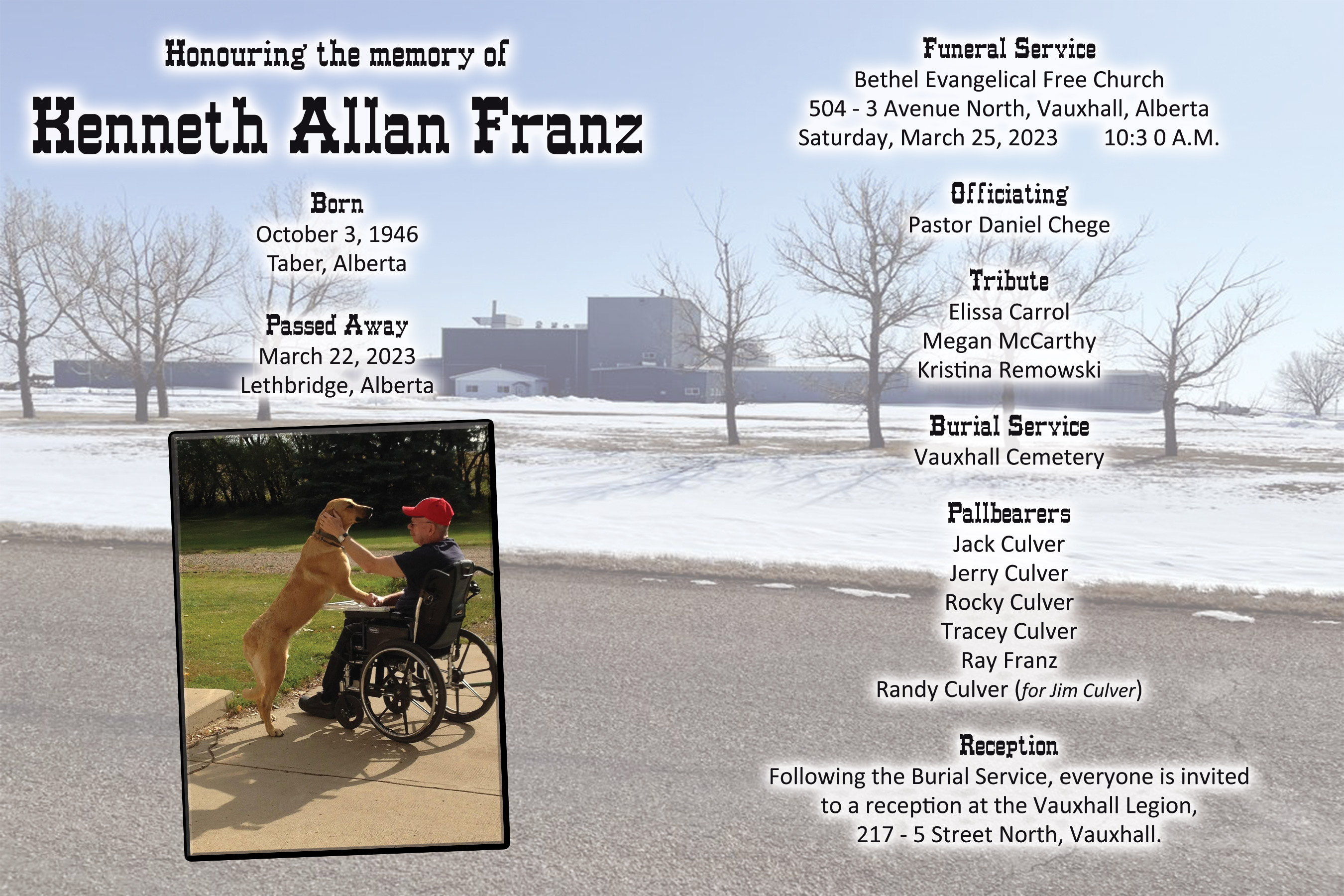 The Funeral Service was held at the Bethel Evangelical Free Church, 504 - 3 Avenue, Vauxhall on Saturday, March 25, 2023 at 10:30 A.M. Burial followed at the Vauxhall Cemetery.