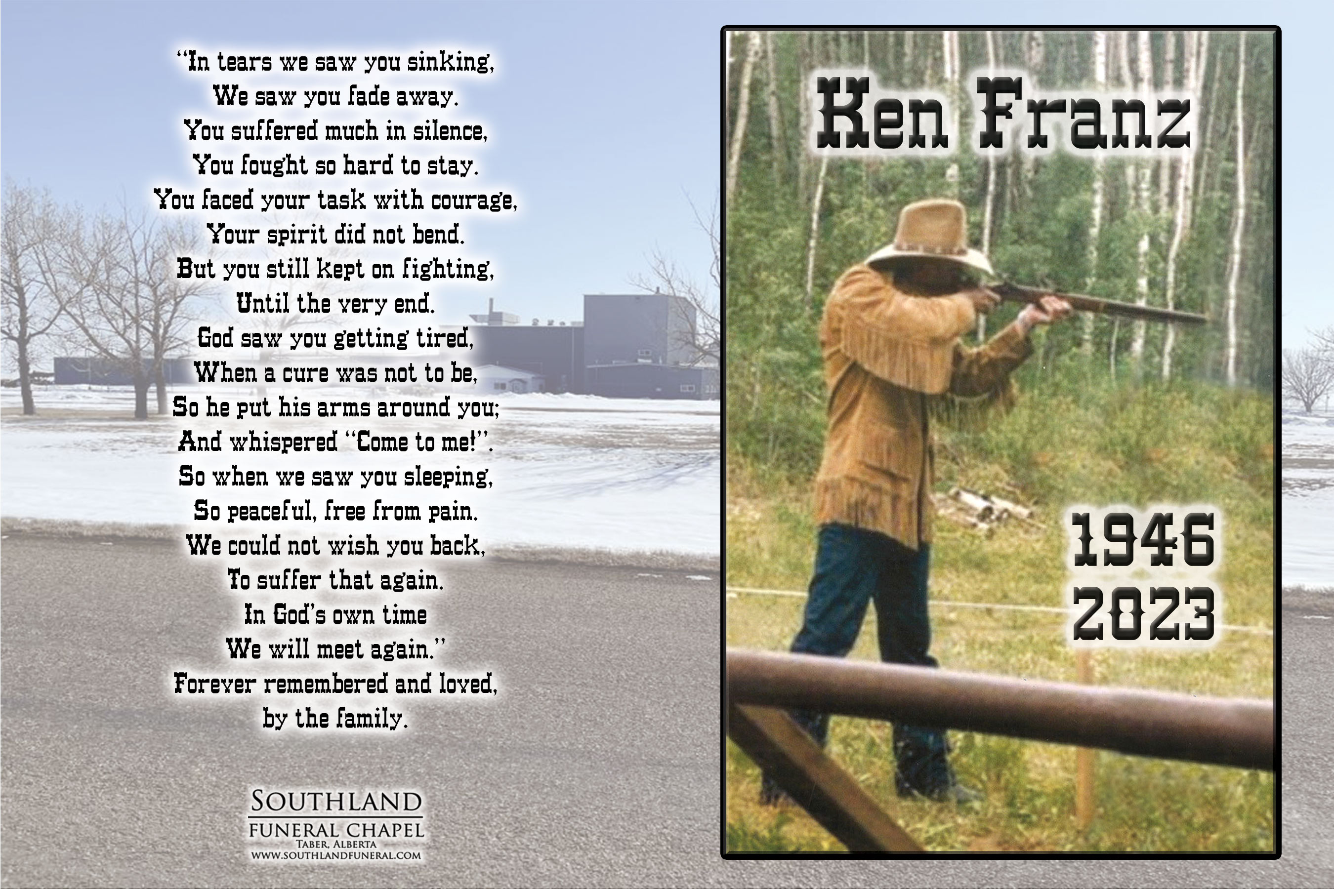 Ken was born on October 3, 1946 in Taber, but lived the majority of his life between Vauxhall and Retlaw, where he met his wife of forty four years, Terry Culver Franz. In 1970, Ken began working for Vauxhall Foods, now Prairie Gold Produce, only leaving his position as a Production Manager after his stroke in 2009. Even after his time away from the plant, his relationships with his previous coworkers remained steadfast. Following his stroke, Ken and Terry travelled to Halifax, Nova Scotia to attend Dalhousie University’s Aphasia Program. This attributed to Ken’s ability to continue living a very fulfilling life. Throughout the years he enjoyed competing in black powder shooting, listening to ZZ Top and contributing to the Retlaw Historical Society including his countless dedicated hours to the restoration of the Retlaw Union/United Church.