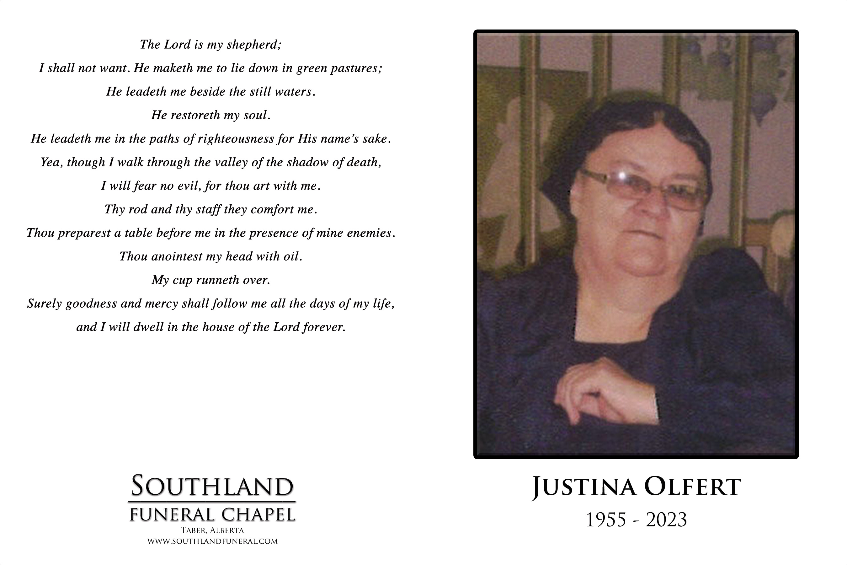 Justina Olfert, beloved wife of John Olfert, passed away in Taber on Friday, March 31, 2023 at the age of 67 years.