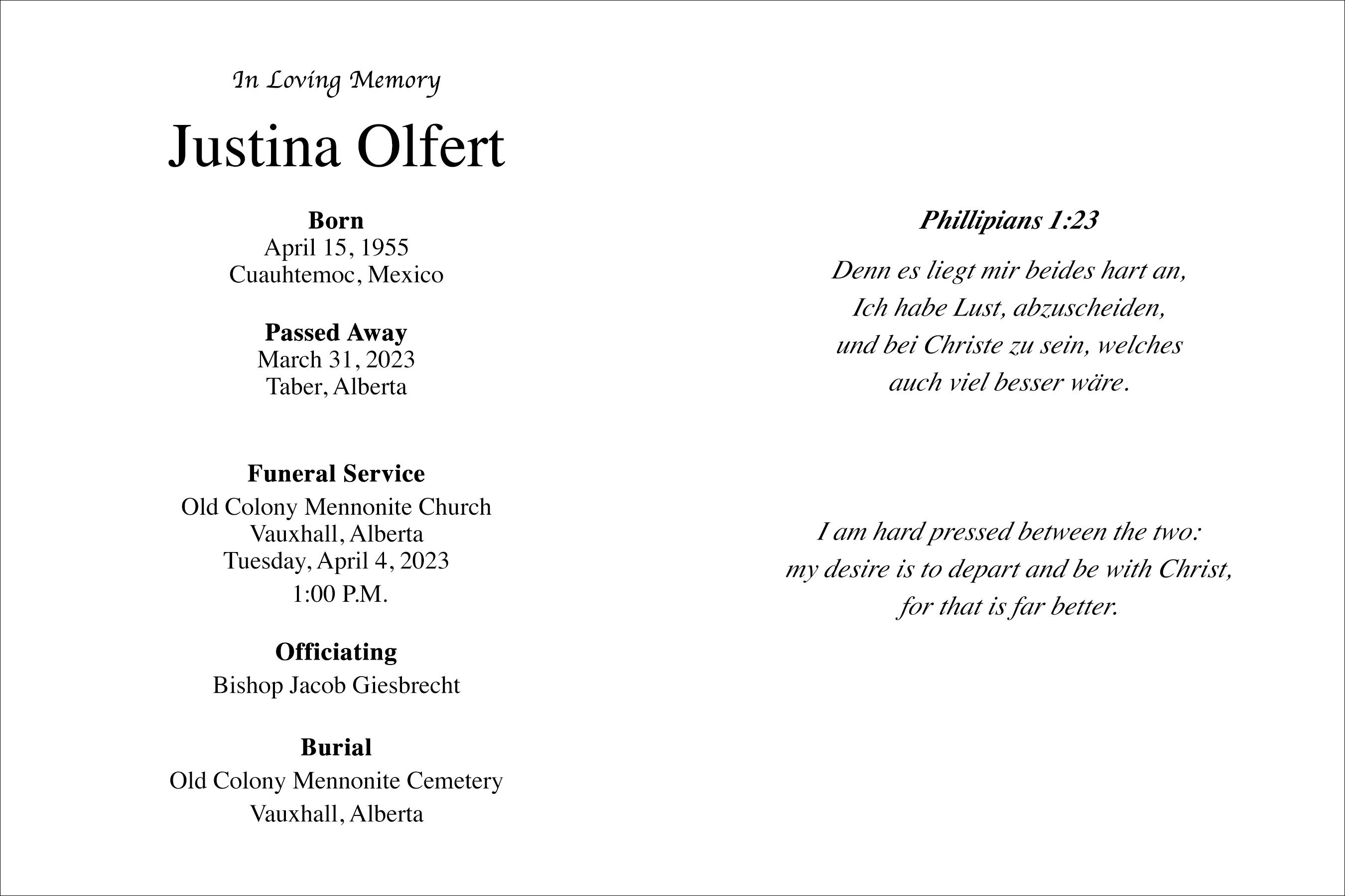 The Funeral Service was held at the Old Colony Mennonite Church, Vauxhall (travel north of Vauxhall on Highway 36 ten kilometres, then nine kilometres west on Highway 526 and finally one kilometre south of the Circle Hill Community Hall on Range Road 172) on Tuesday, April 4, 2023 at 1:00 P.M. Burial followed at the Old Colony Mennonite Cemetery, Vauxhall.