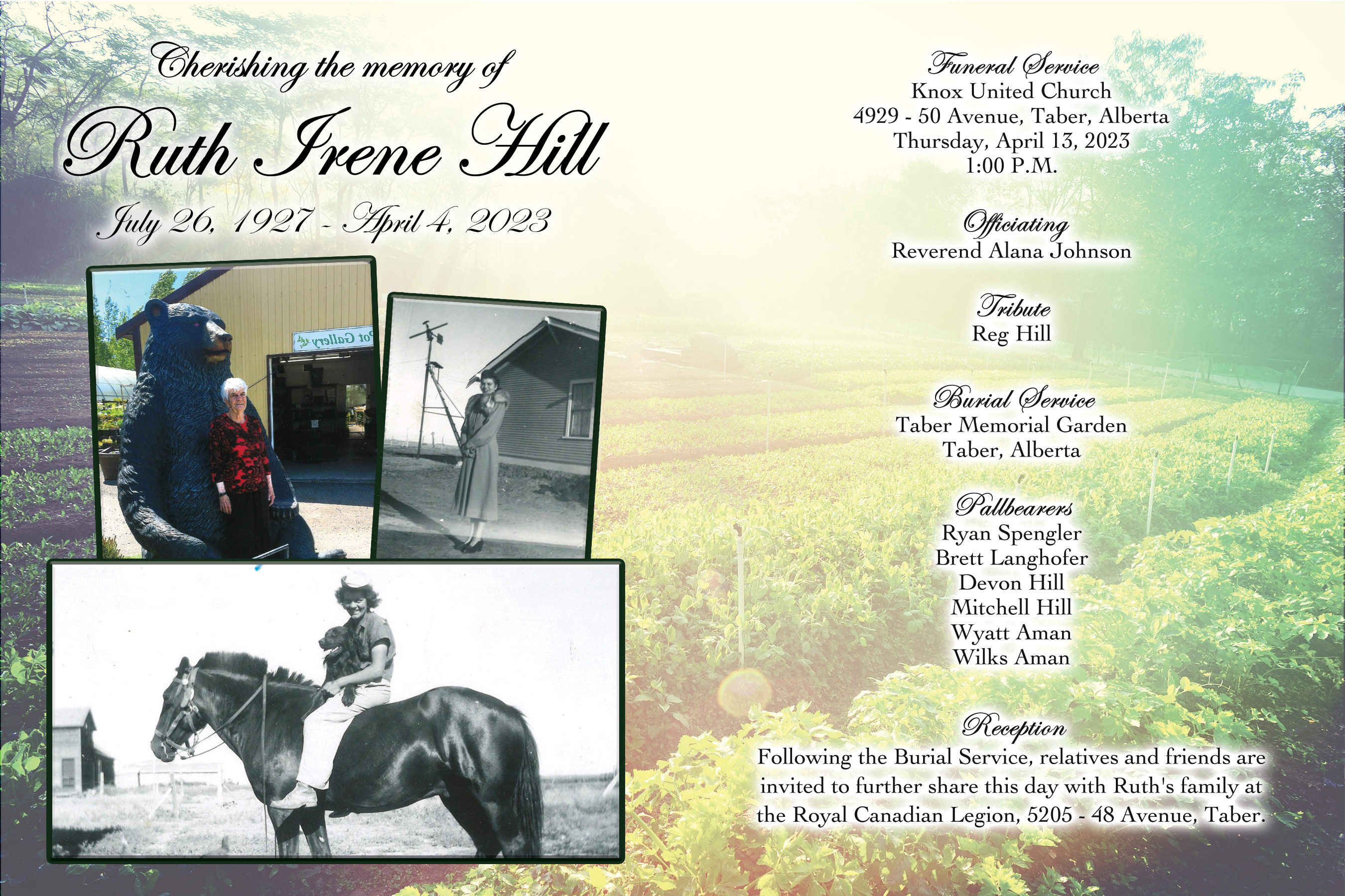 The Funeral Service was held at Knox United Church, 4929 - 50 Avenue, Taber on Thursday, April 13, 2023 at 1:00 P.M. Burial followed at the Taber Memorial Garden.