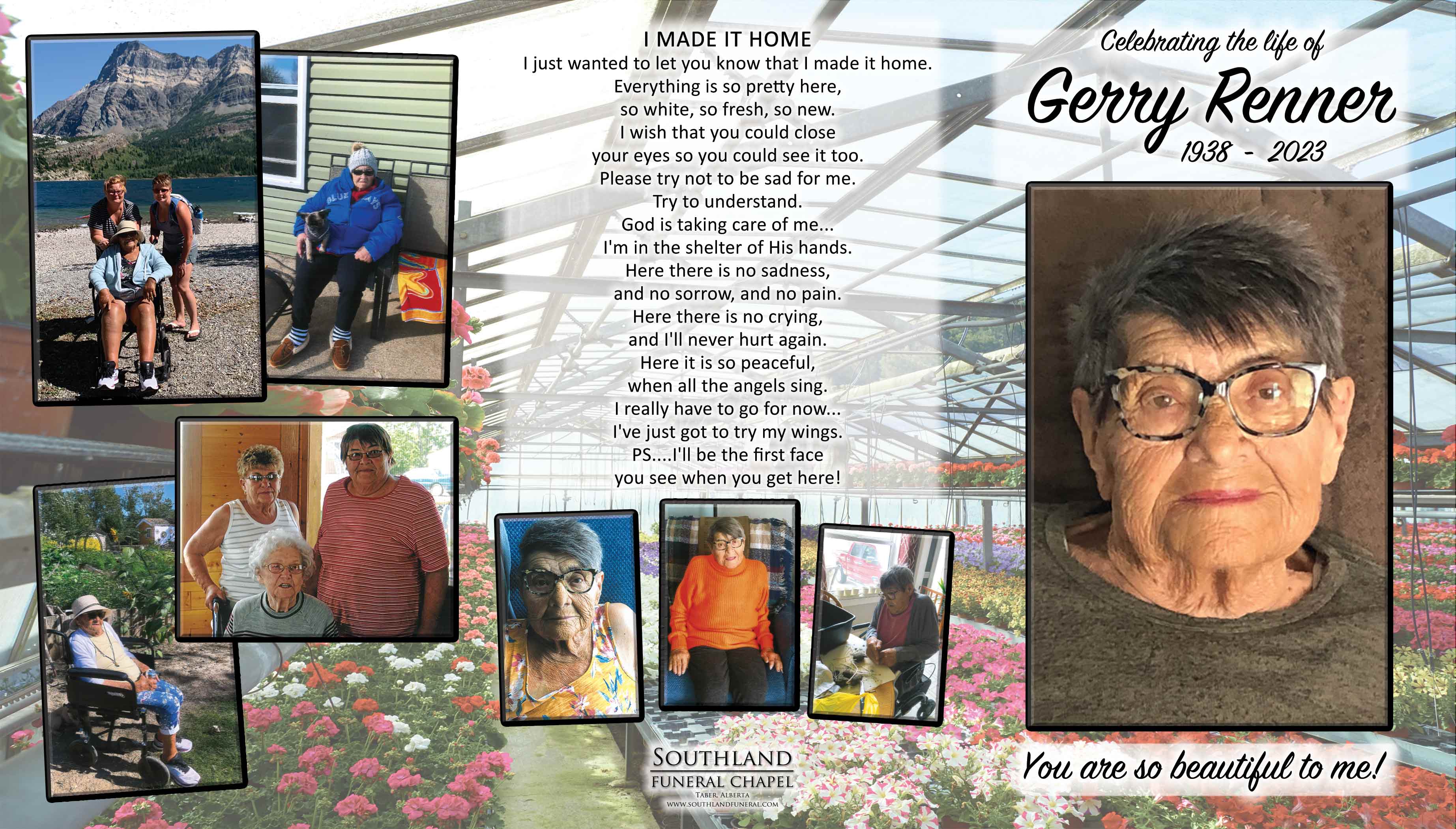 A come and go celebration of Gerry’s life was held at 5804 - 58 Street, Taber, in her yard, which was her happy place, on Friday, July 7, 2023 between 2:00 P.M. and 4:00 P.M.