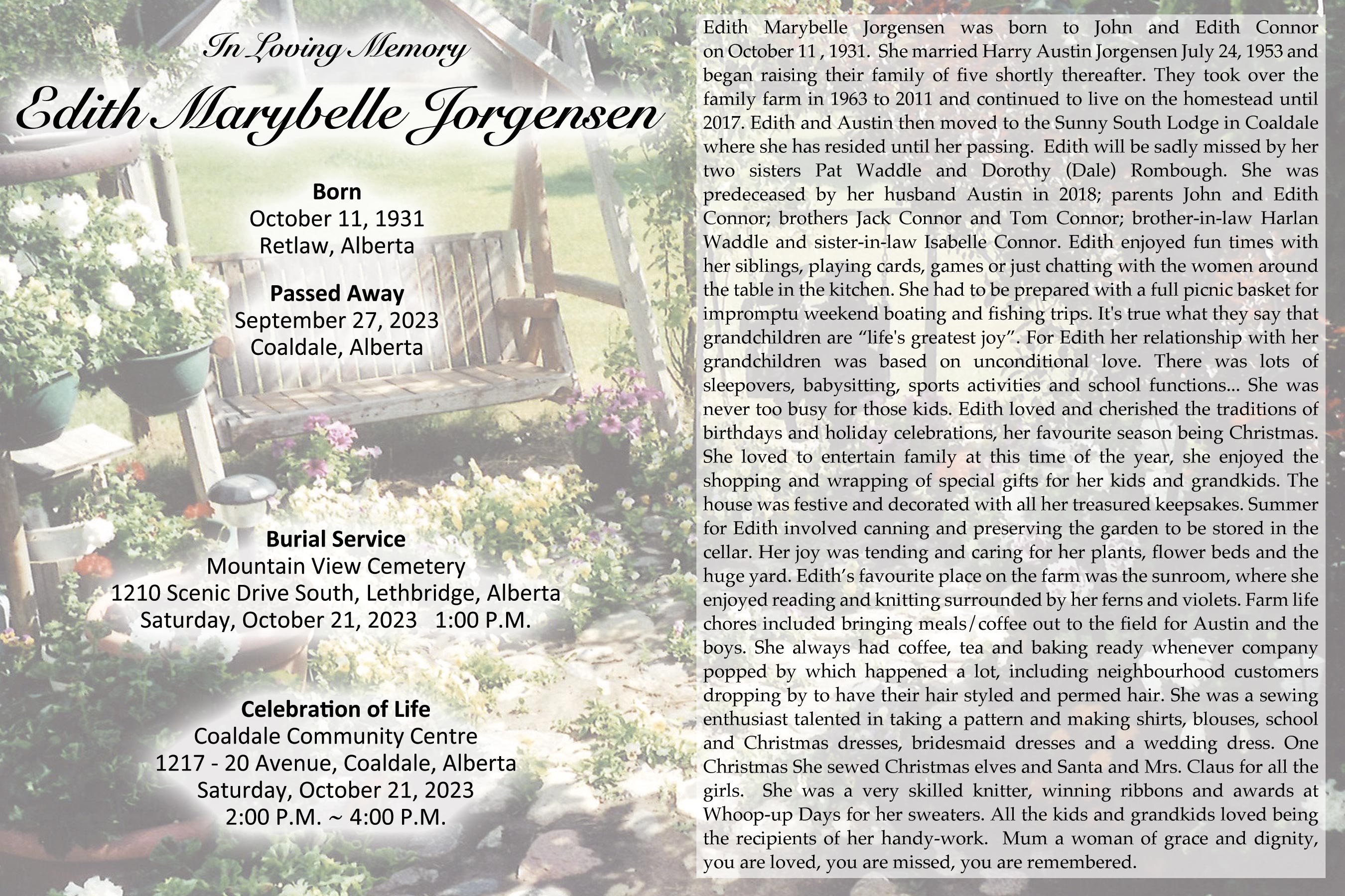 Edith Marybelle Jorgensen, beloved wife of the late Austin Jorgensen, passed away in Coaldale on Wednesday, September 27, 2023 at the age of 91 years.