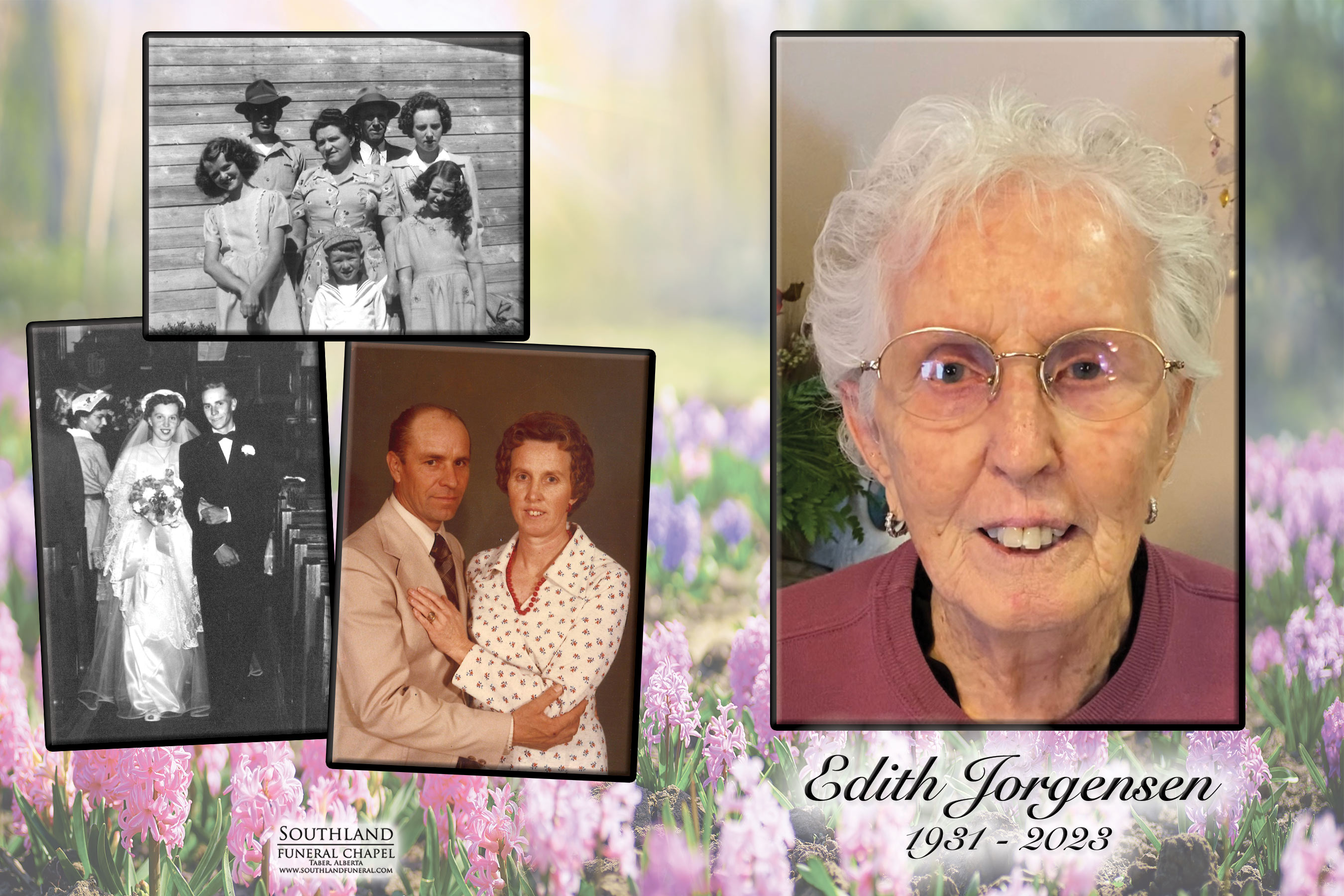 Edith was born to John and Edith Connor on October 11, 1931. She married Harry Austin Jorgensen on July 24, 1953 and shortly thereafter they began raising their family of five. They took over the family farm in 1963 to 2011 and continued to live on the homestead until 2017. Edith and Austin moved to Sunny South Lodge in Coaldale where she has resided until her passing.