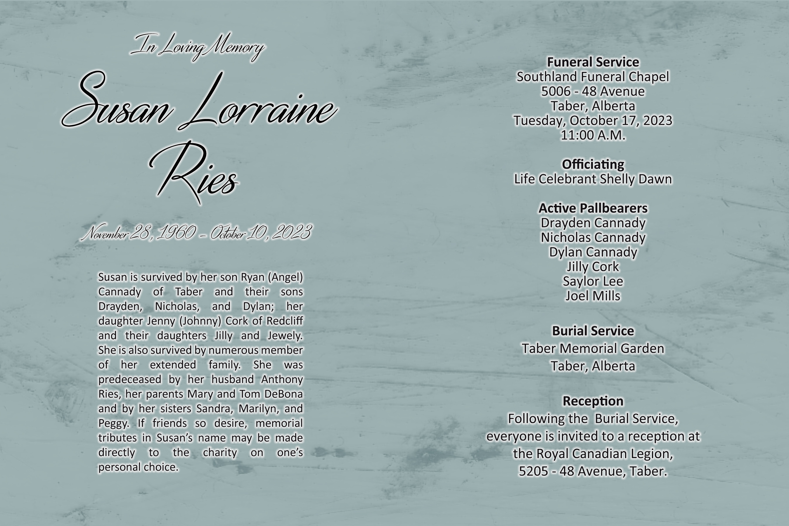 The Funeral Service was held at Southland Funeral Chapel, 5006 – 48 Avenue, Taber on Tuesday, October 17, 2023 at 11:00 A.M. with Life Celebrant Shelly Bassett officiating. Burial followed at the Taber Memorial Garden.