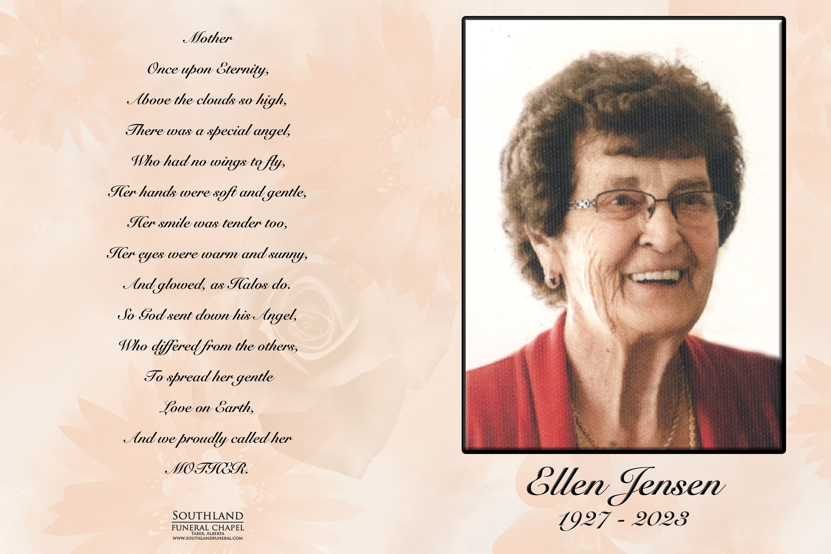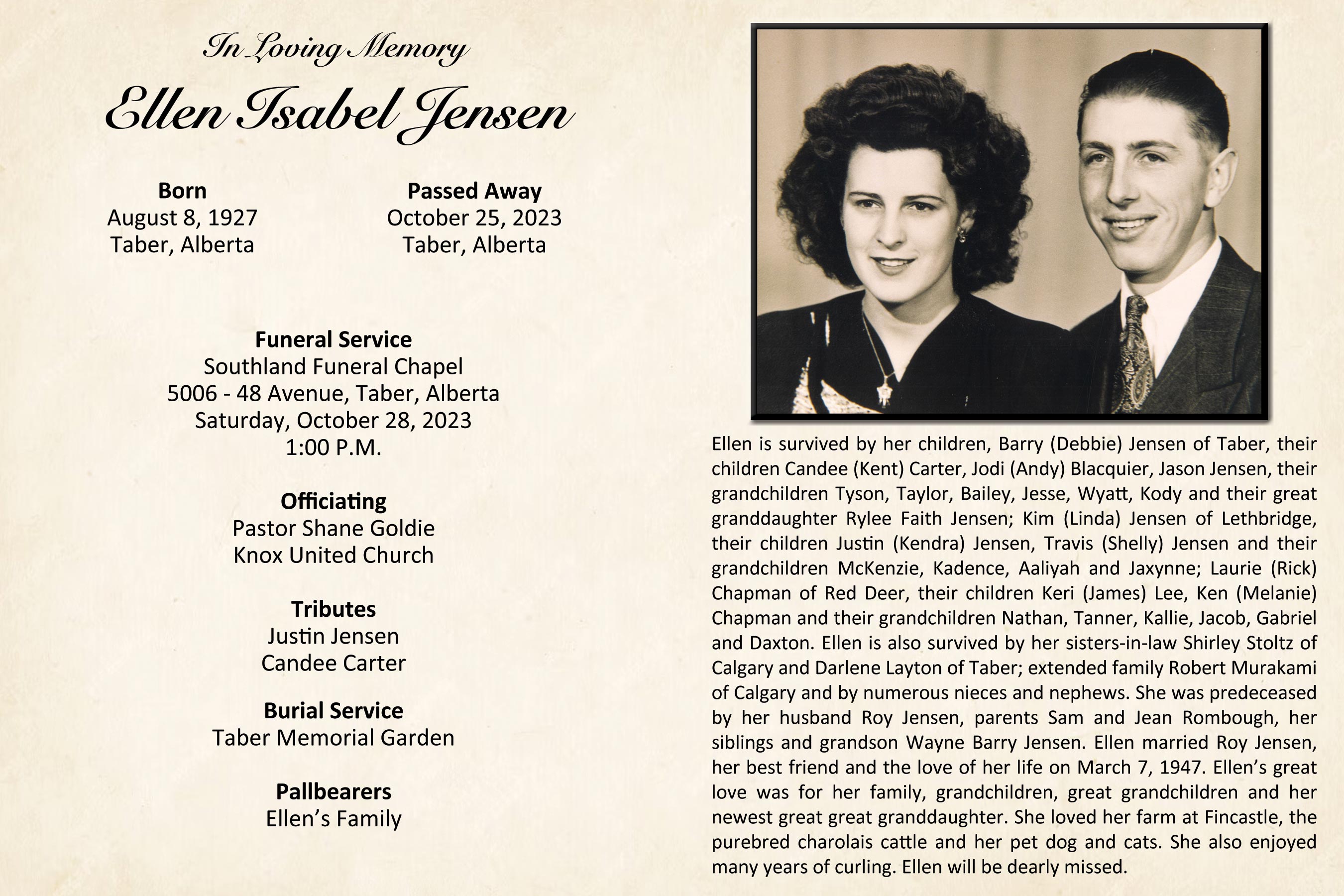 Ellen Isabel Jensen, beloved wife of the late Roy Jensen, passed away peacefully in Taber, surrounded by her family, on Wednesday, October 25, 2023 at the age of 96 years.