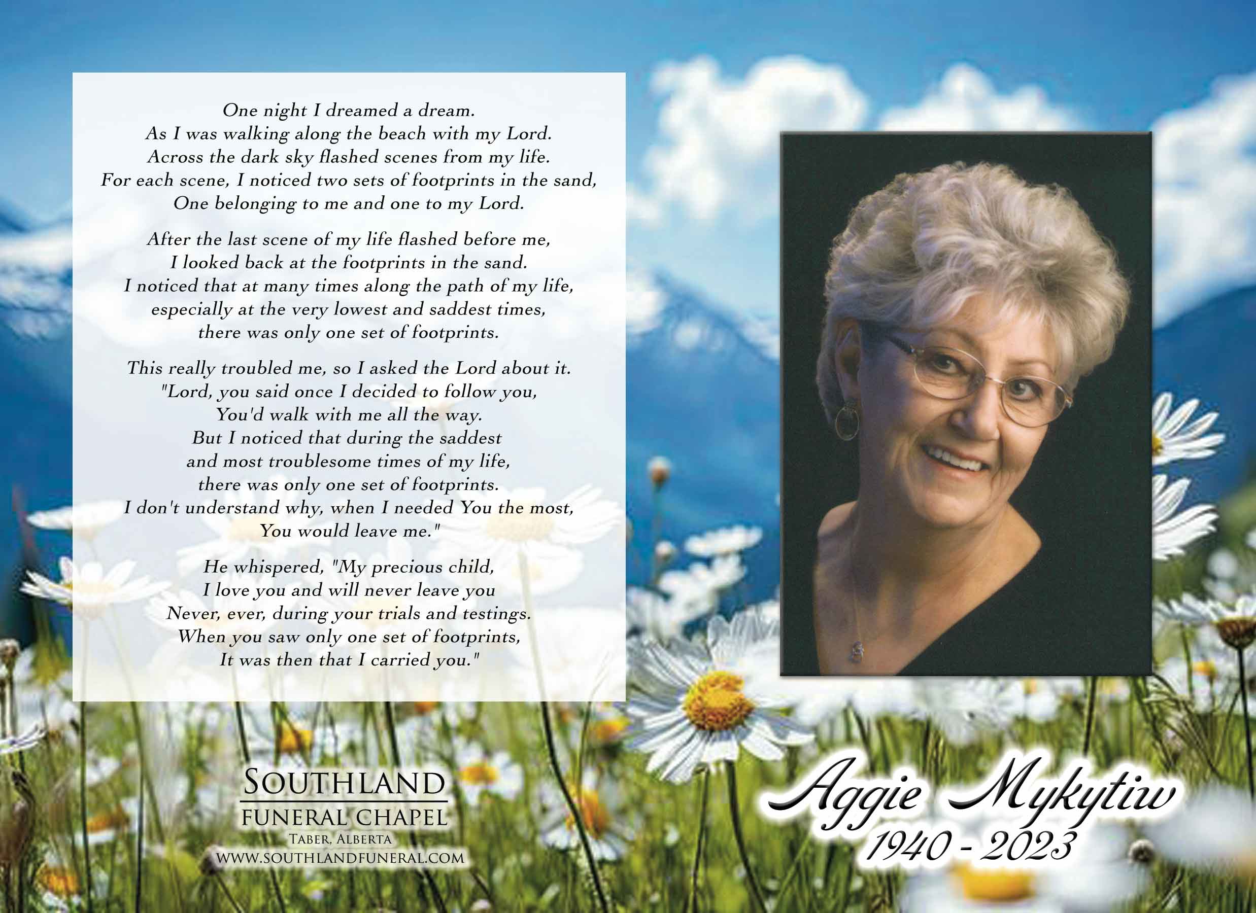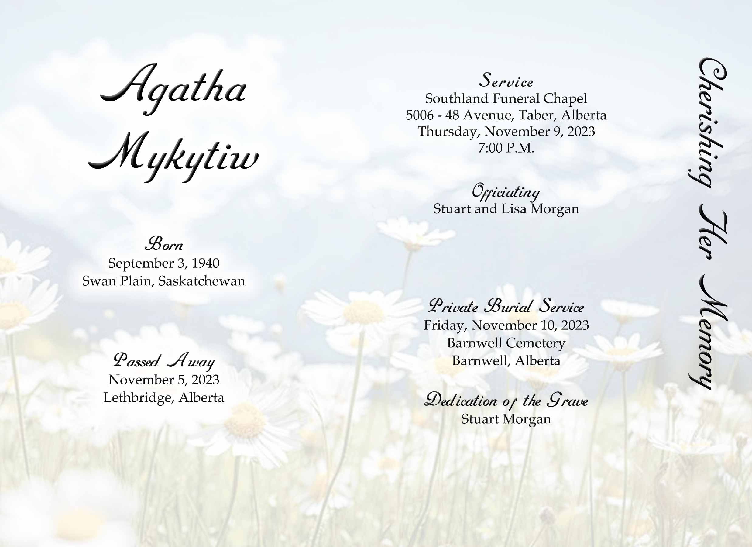 Relatives and friends were invited to join the family for a time of remembrance service at Southland Funeral Chapel, 5006 - 48 Avenue, Taber on Thursday, November 9, 2023 at 7:00 P.M.