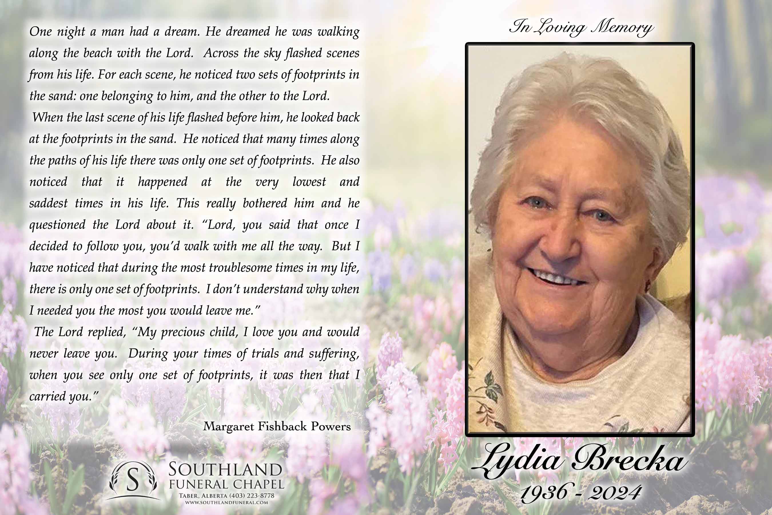 Relatives and friends were invited to Prayers at Southland Funeral Chapel, 5006 - 48 Avenue, Taber on Wednesday, February 7, 2024 at 7:00 P.M.