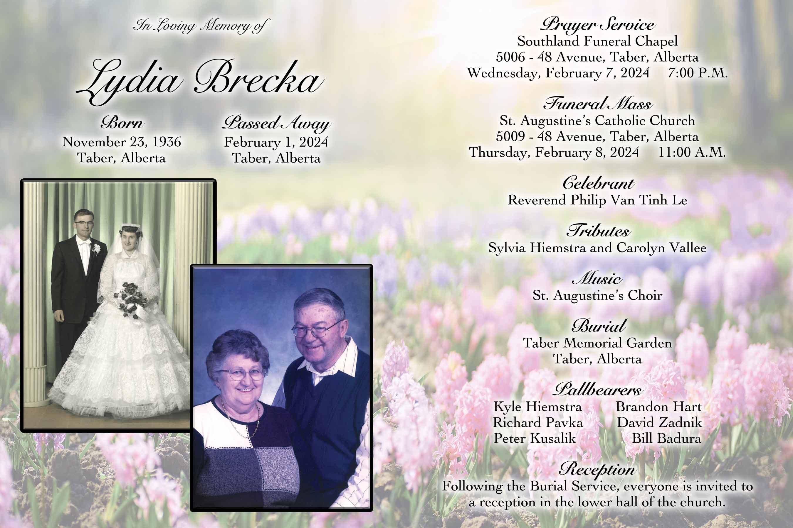 The Funeral Mass was celebrated at St. Augustine's Catholic Church, 5009 - 48 Avenue, Taber on Thursday, February 8, 2024 at 11:00 A.M. Burial followed at the Taber Memorial Garden.
