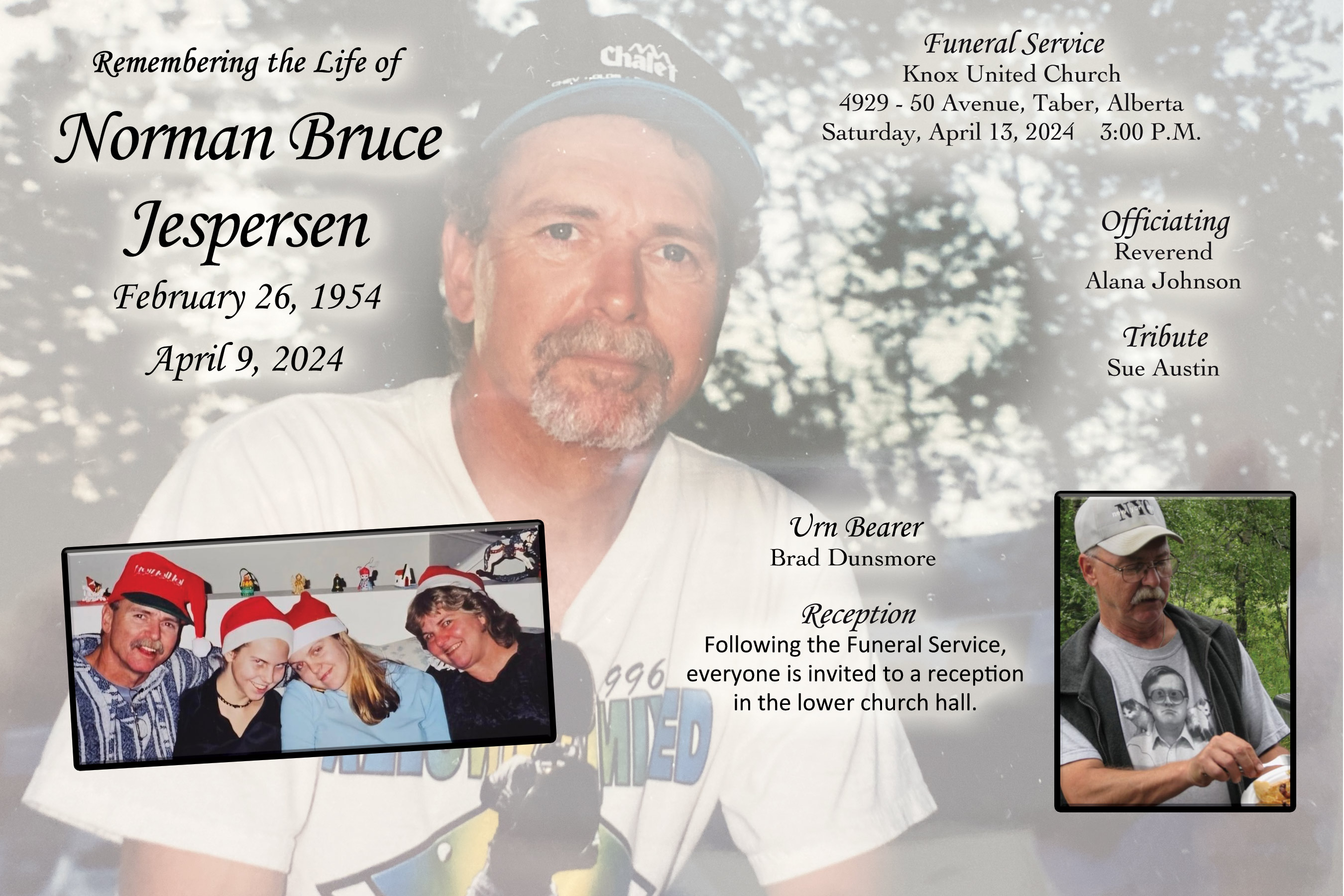 Norman Bruce Jespersen, beloved husband of Brenda Jespersen, passed away in Lethbridge on Tuesday, April 9, 2024 at the age of 70 years following a courageous battle with cancer.