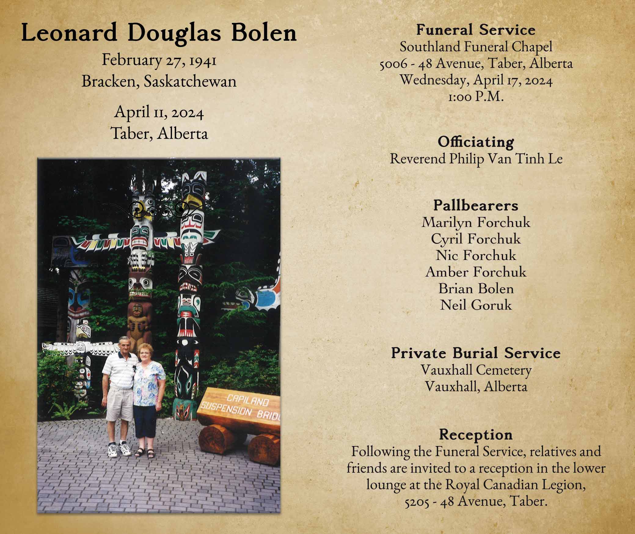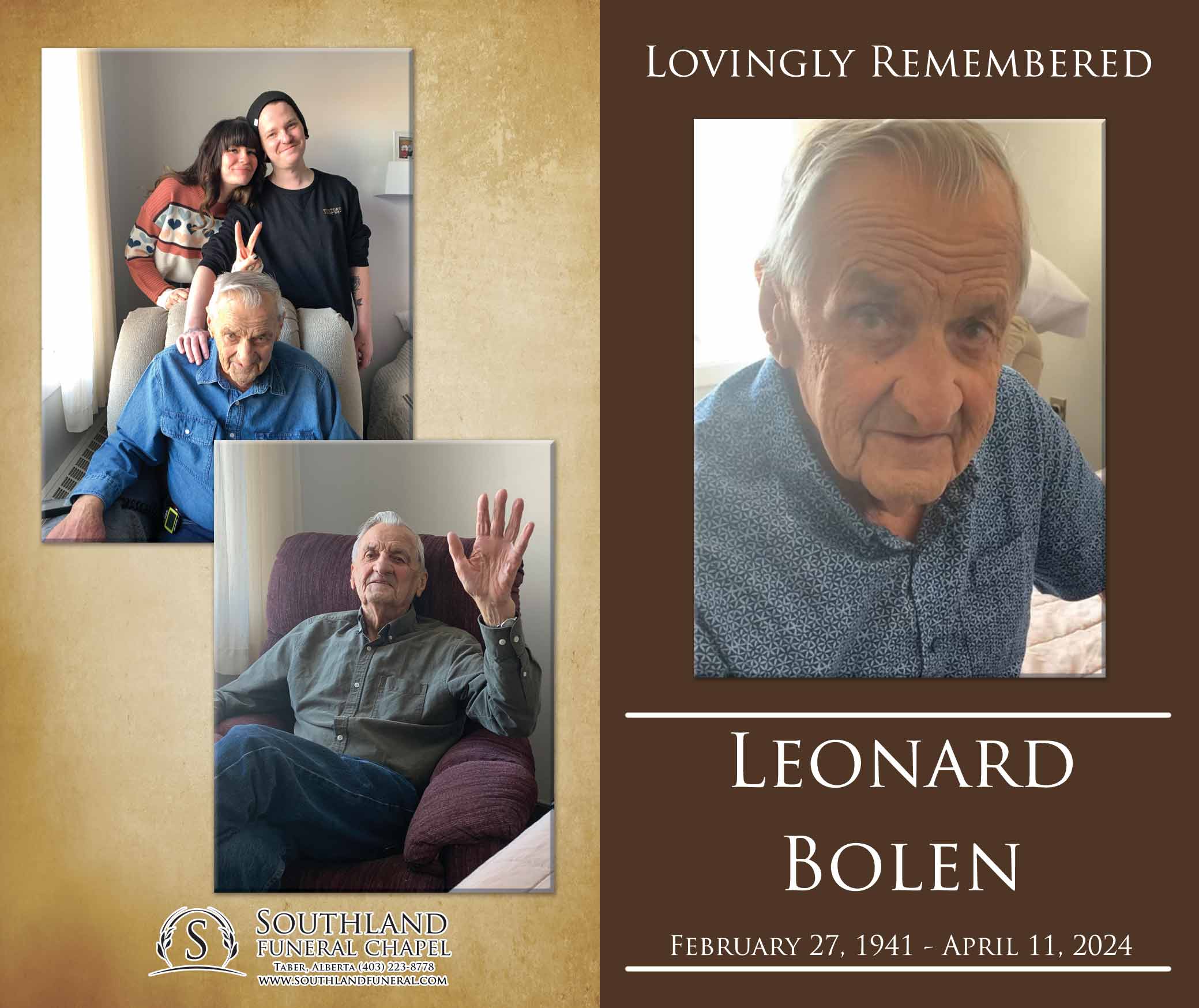 Leonard Douglas Bolen, passed away in Taber on Thursday, April 11, 2024 at the age of 83 years.