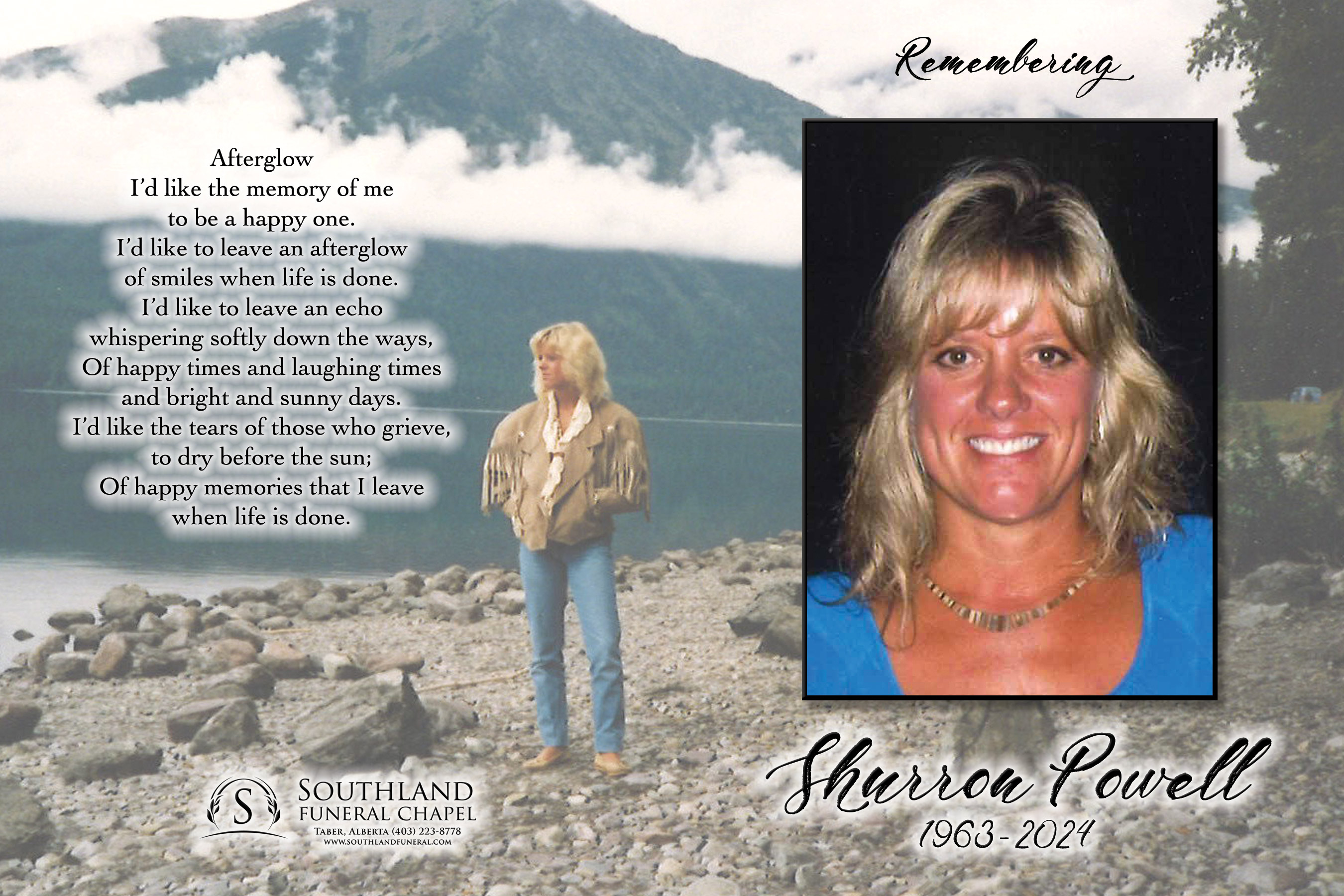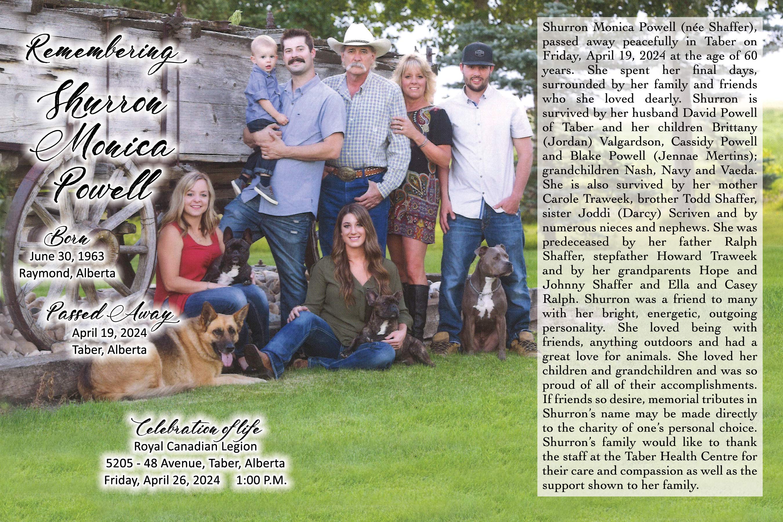 Shurron Monica Powell (née Shaffer), passed away peacefully in Taber on Friday, April 19, 2024 at the age of 60 years. She spent her final days, surrounded by her family and friends who she loved dearly.